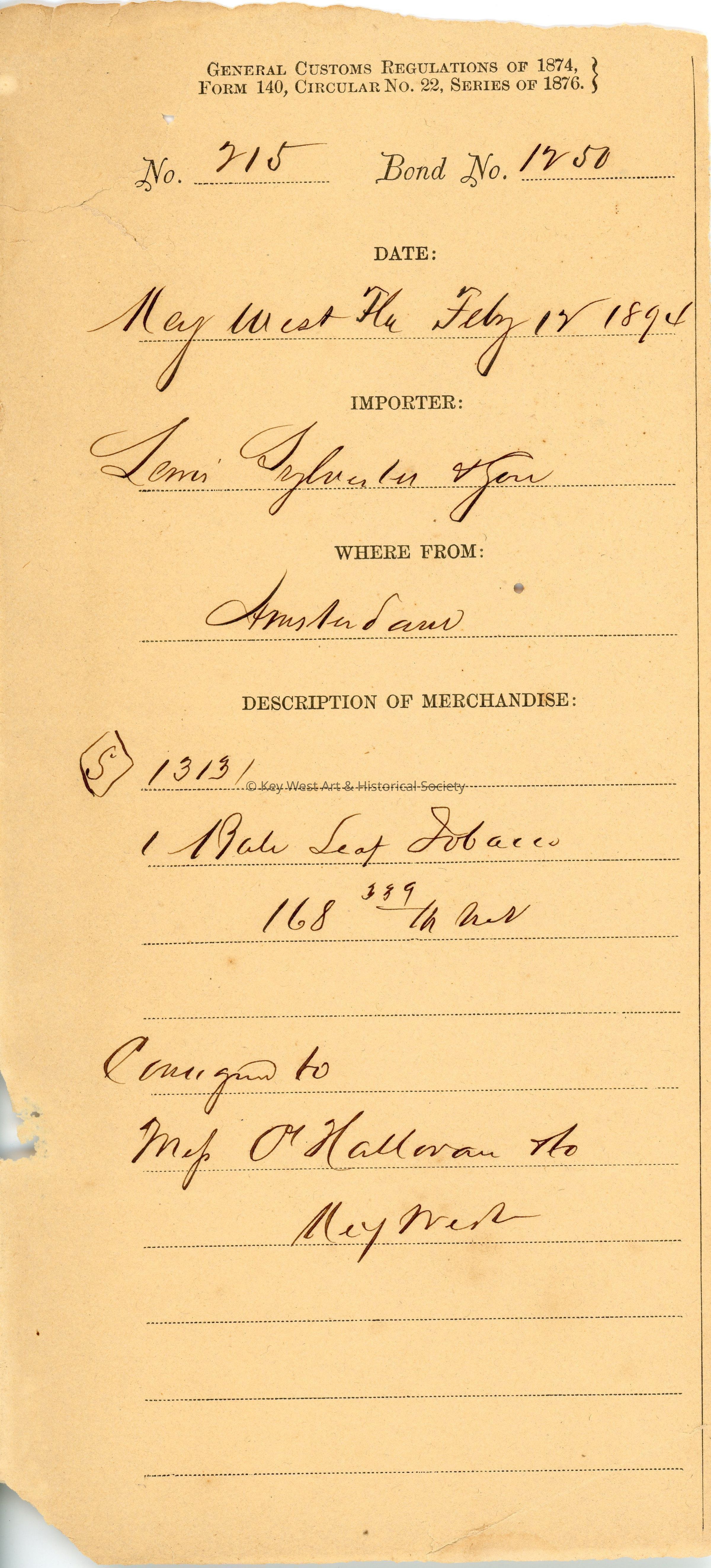 Customs receipt for the importation of one bale of leaf tobacco from Amsterdam by Lewis Sylvester & Son which was consigned to O'Halloran & Co. in Key West. Dated February 12, 1894.