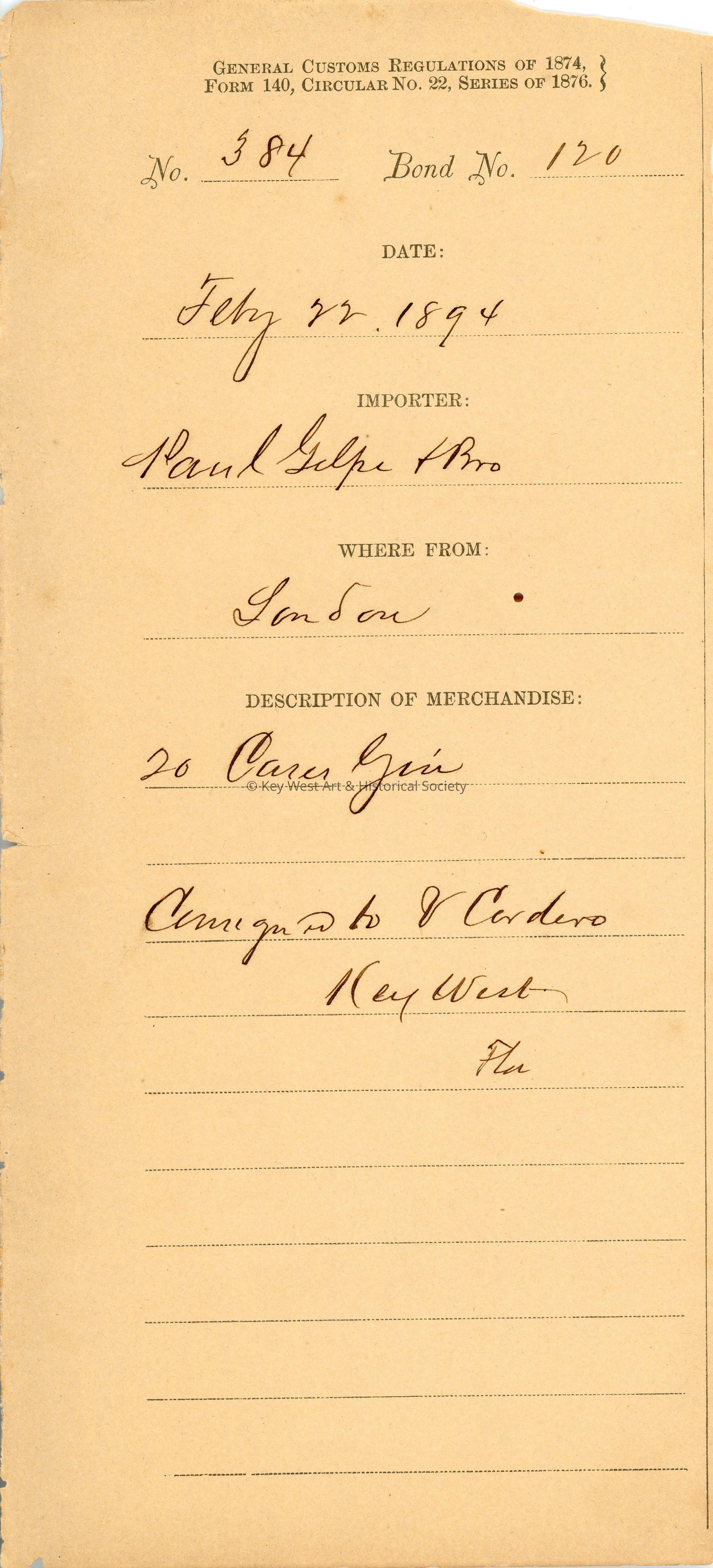 Customs receipt for the importation of twenty cases of gin from London by Paul Gelpi & Bro. which were consigned to V. Cordero in Key West. Dated February 22, 1894.