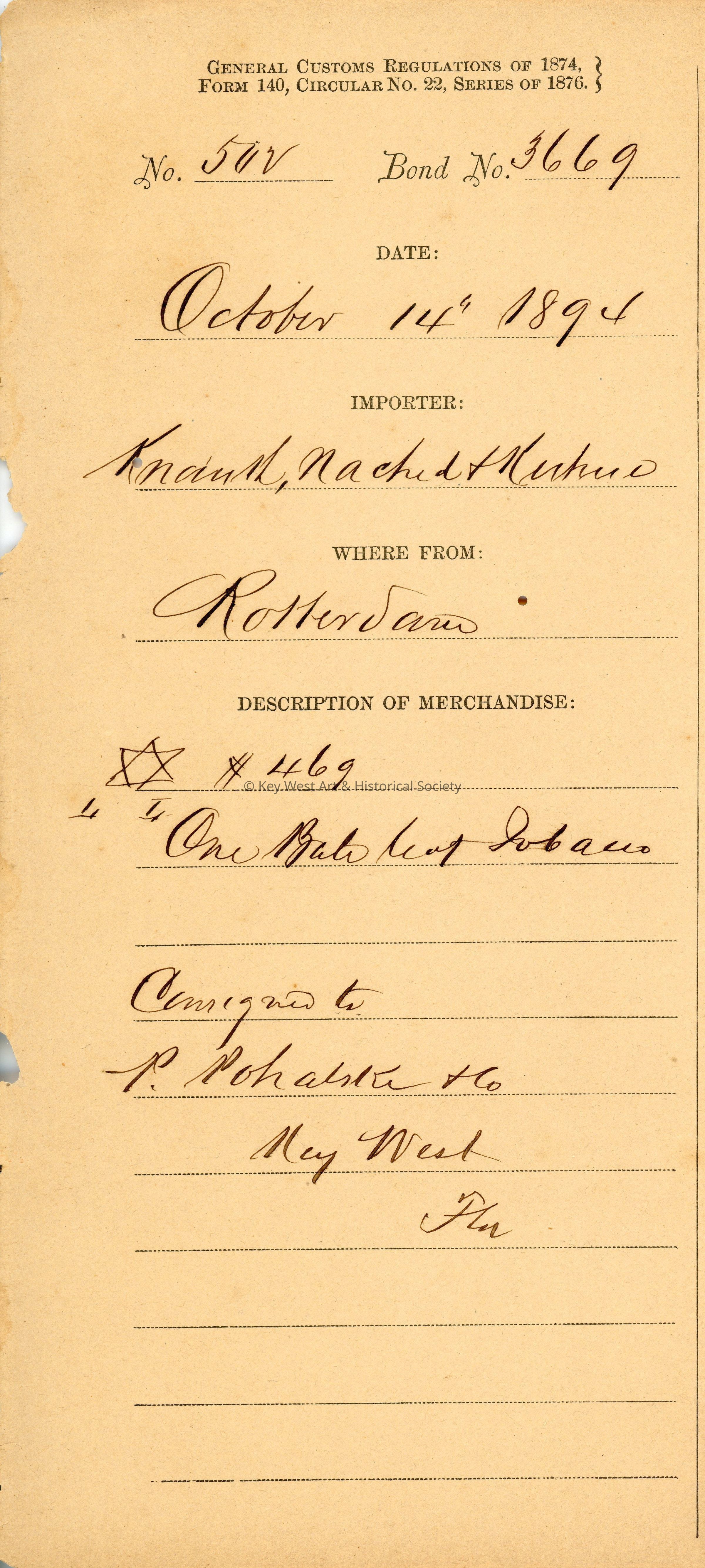 Customs receipt for the importation of one bale of leaf tobacco from Rotterdam by Knauth, Nachid and Kuehne which was consigned to P. Pohalski & Co. in Key West. Dated October 14, 1894.