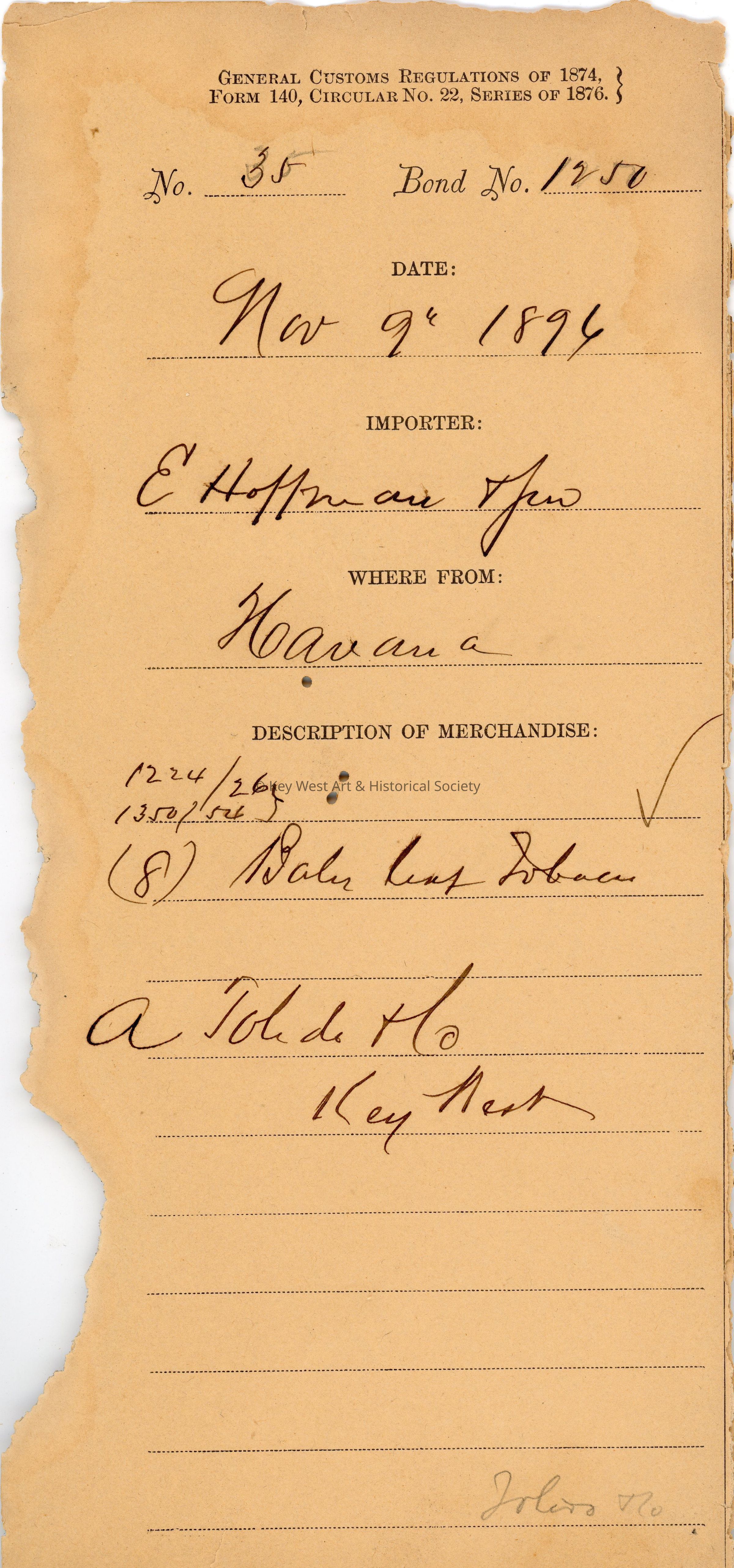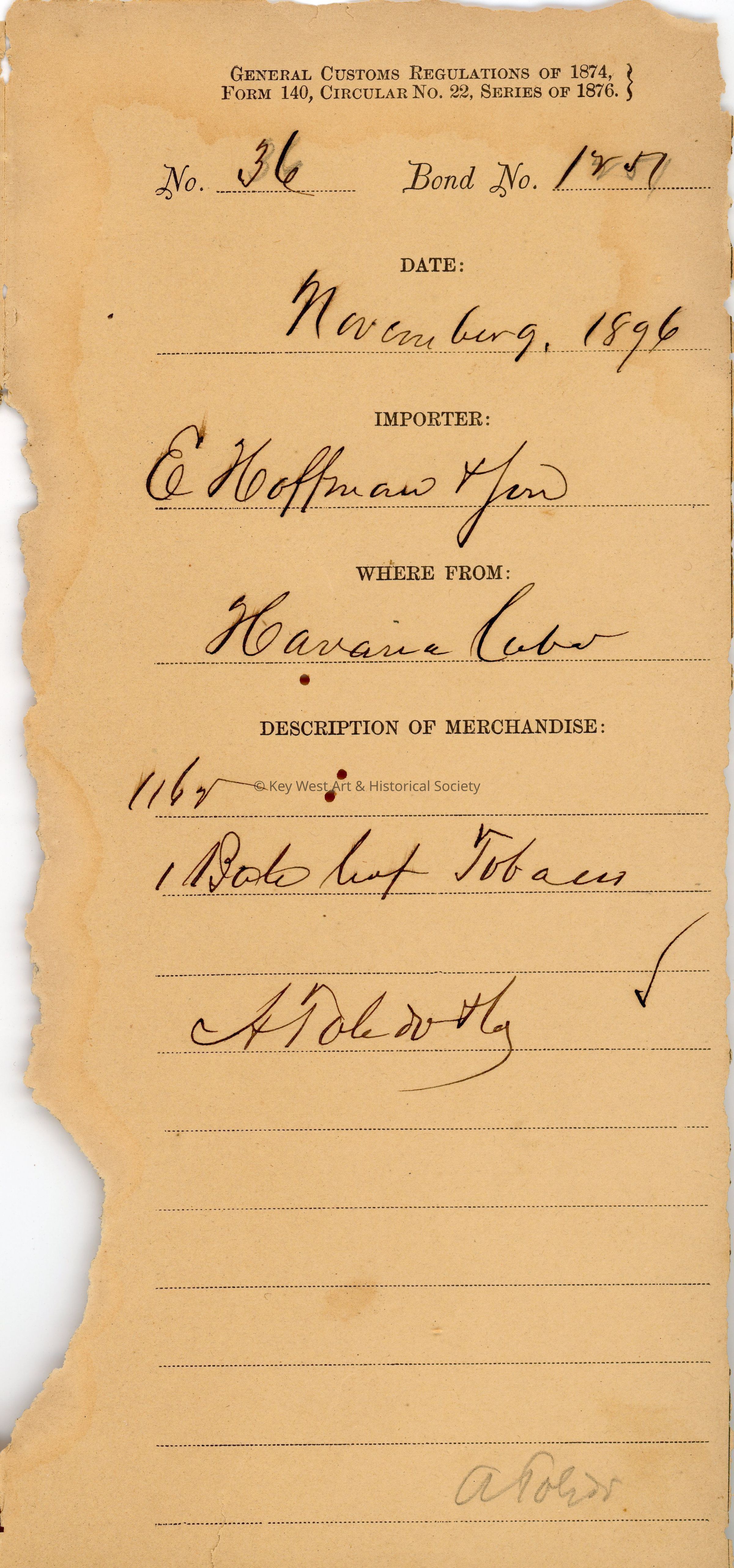 Two Customs receipts for the importation of nine bales of leaf tobacco from Havana, Cuba by E. Hoffman & Son which were consigned to A. Toledo & Co. Dated November 9, 1896.
