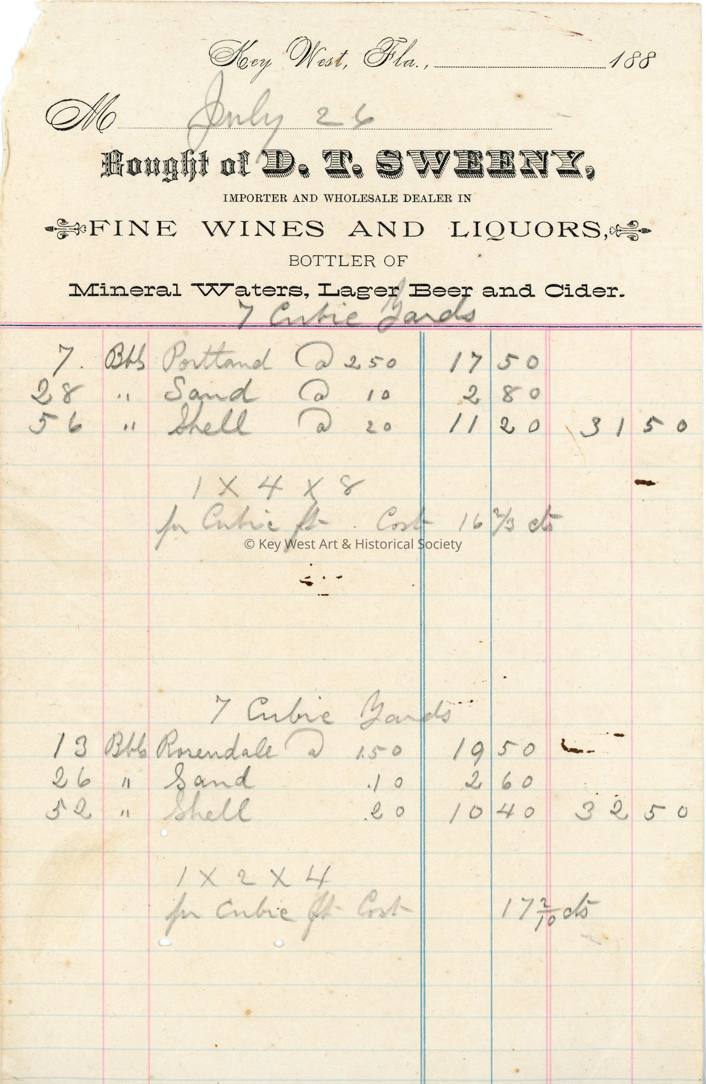Lined stationery for D.T. Sweeny, Importer and Wholesale Dealer in Fine Wines and Liquors, Bottler of Mineral Waters, Lager Beer and Cider. Writing on the stationery details the cost and materials needed to make seven cubic yards of a concrete, sand, and shell mixture.Collection