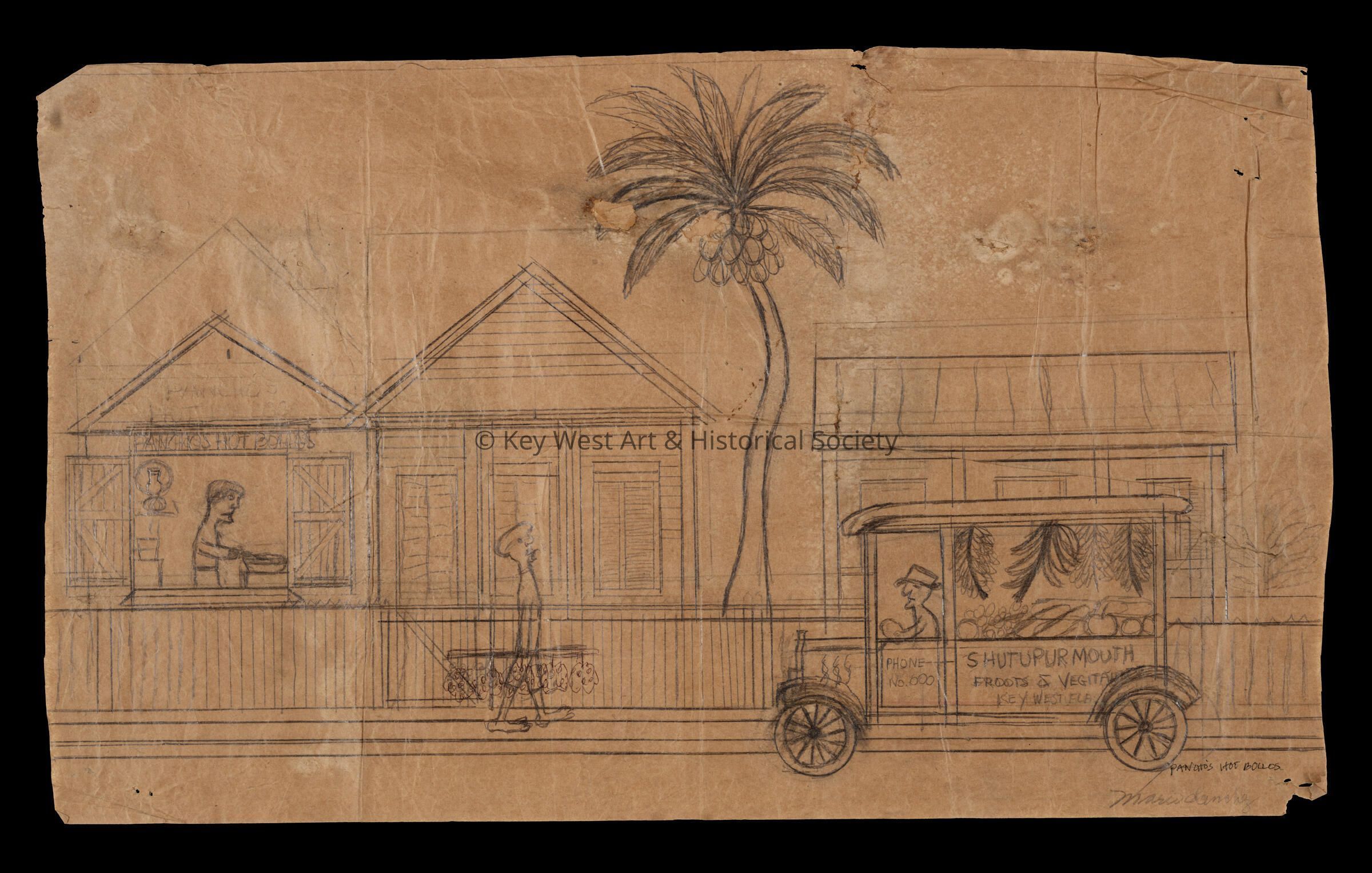 Pencil sketch on an unfolded paper bag by Mario Sanchez depicting Pancho selling his hot bollos. The ShutUpUrMouth Froots [sic] & Vegitables [sic] cart is passing by as the Spanish Lime boy walks down the street.Type of Drawing