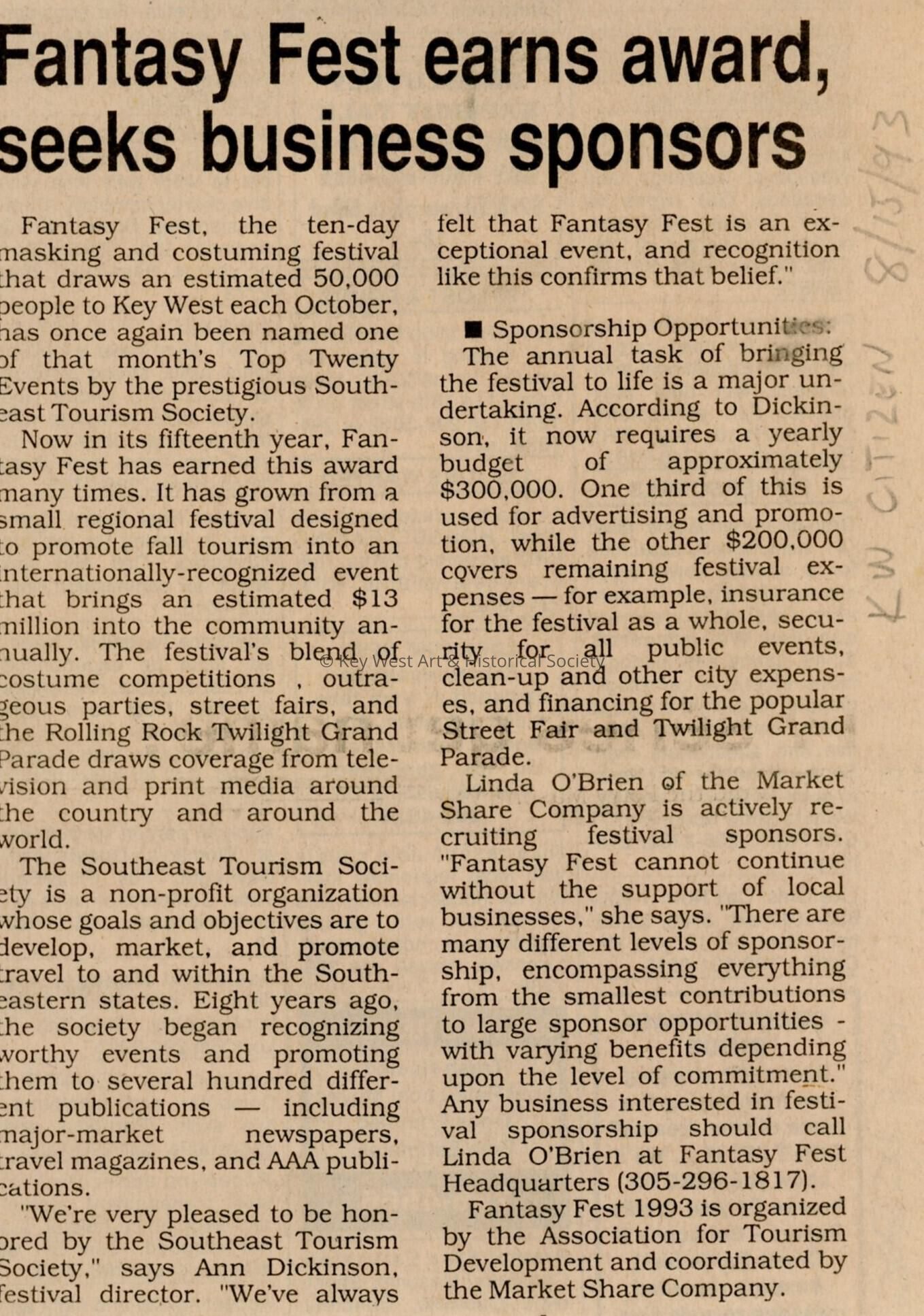 An article in the Key West Citizen that reads Fantasy Fest earns award, seeks business sponsors.Entry/Object ID