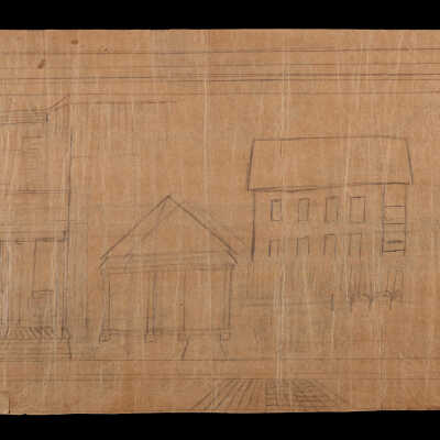 Pencil sketch on an unfolded paper bag by Mario Sanchez depicting a street scene featuring Kirchick's Dry Goods store, Juan Lopez Groceries, Fruit, Fancy Staples store and Quo Vadis Typewriter & Cash Register Repair Shop. The Buckteeth street vendor is passing by with his cart of balloons while a Goodyear Blimps is flying overhead.  There is an unfinished sketch on the verso depicting unfinished houses and street.Type of Drawing