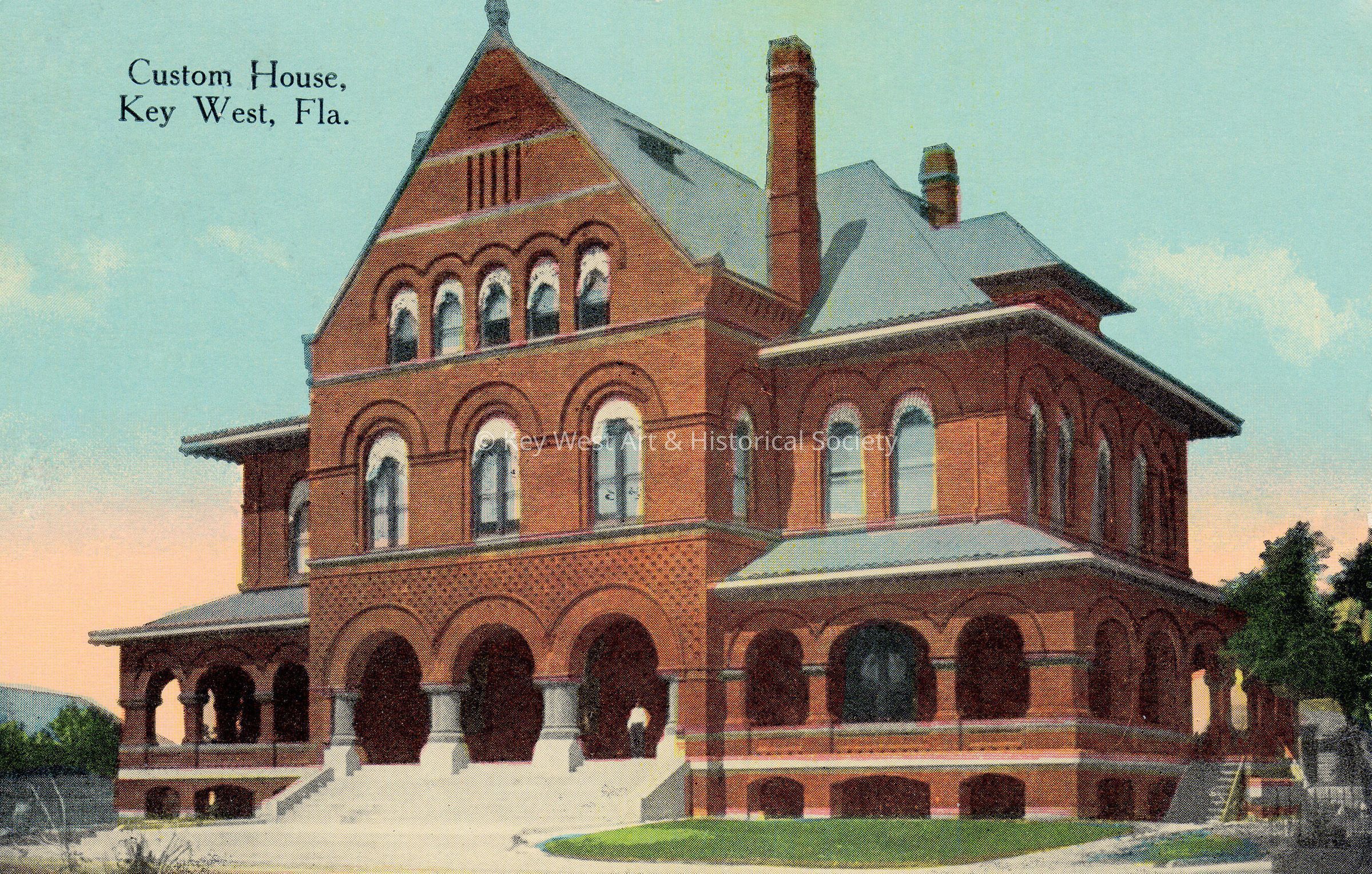 Postcard depicting a large red-brick building. The caption reads, ‘Custom House, Key West, Florida’. The message the verso reads, ‘Have been home month now and I am ready to leave again as nothing ever happens here. Saw Mr. Purcey a few weeks ago but guess he has left town.’ The card is addressed to Mrs. and Mr. E. Gray, New Berlin, Florida, and is postmarked Key West, June 20, 1914.Subject Place