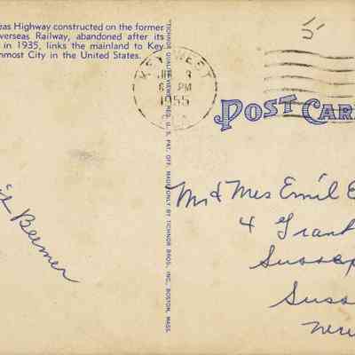 Postcard depicting the highway that goes to sea heading for the Southernmost City, Key West, Florida. The new Overseas Highway constructed on the former roadbed of the Overseas Railway, abandoned after its partial destruction in 1935, links the mainland to Key West, the Southernmost City in the United States.Collection