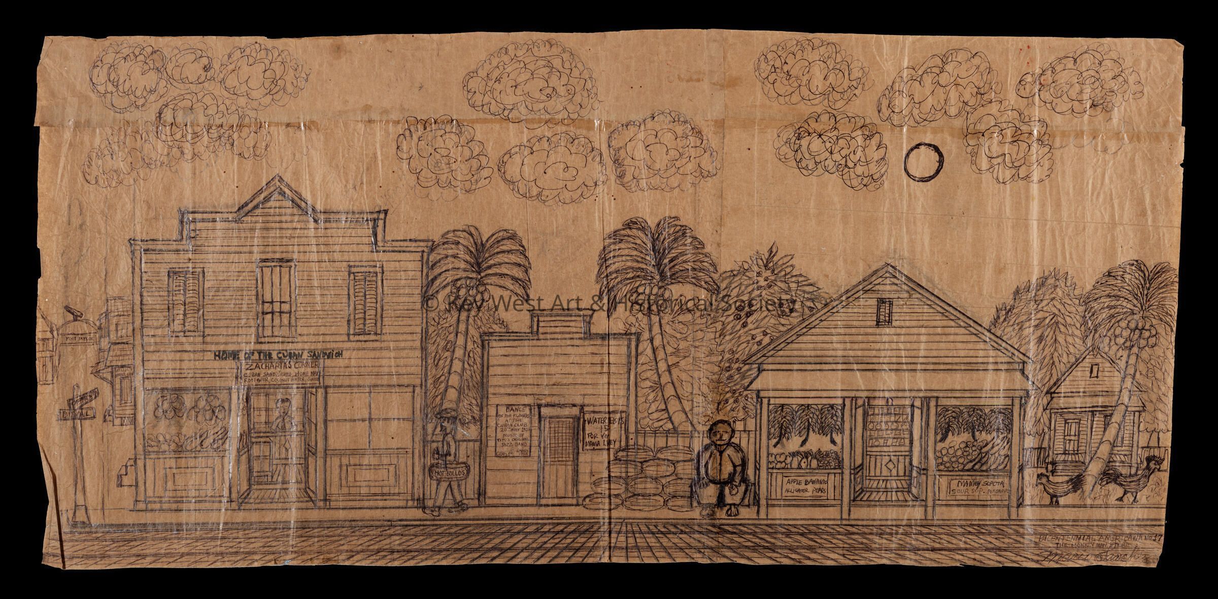 Pencil sketch on an unfolded paper bag by Mario Sanchez depicting the corner of Duval and Petronia streets.  The stores on Duval Street are Zacharia's Corner and Monkey Man's Fruit Store.  The Hot Bollos street vendor passes by.Type of Drawing