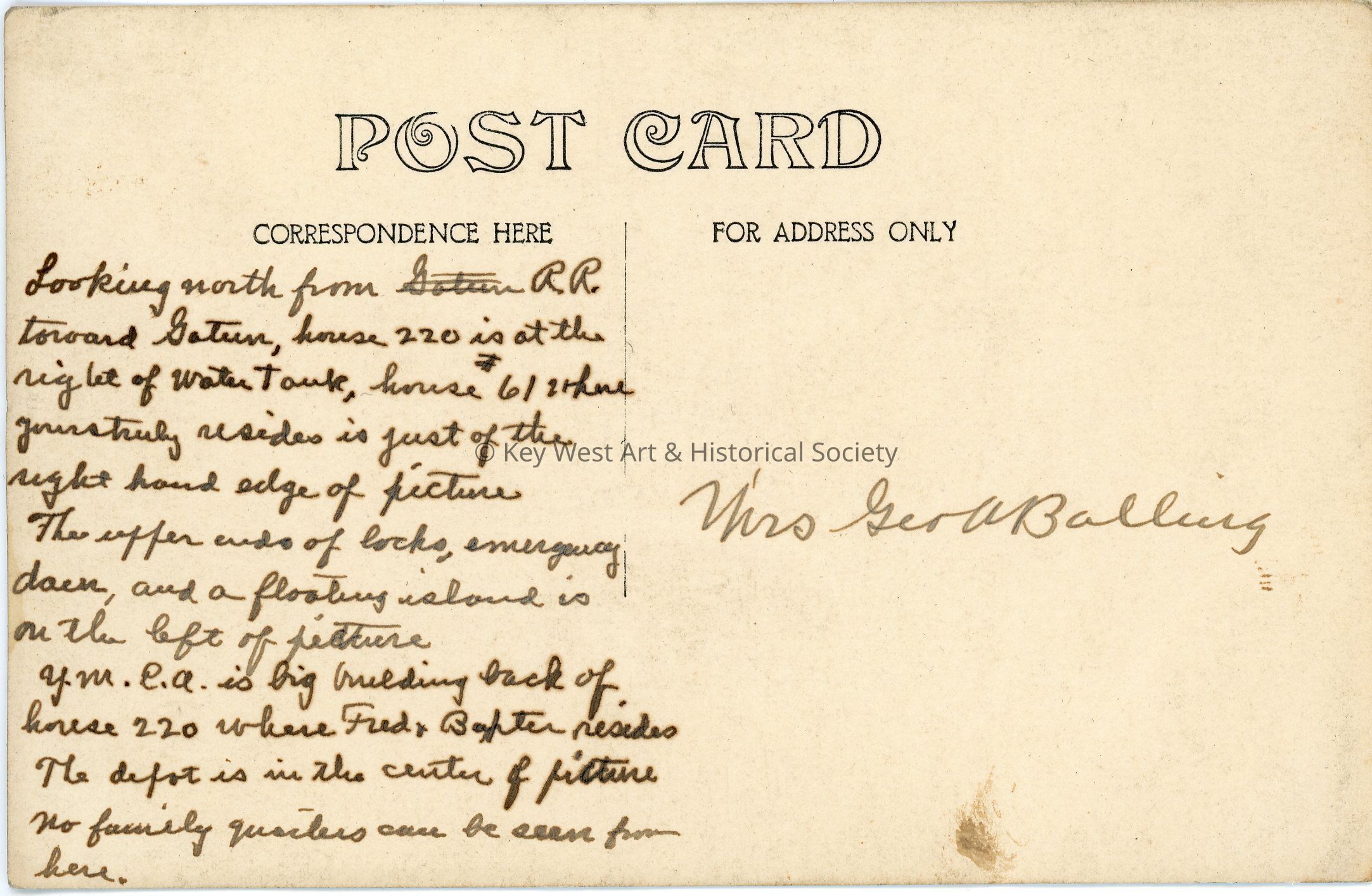 Black and white photograph postcard depicting the construction of the Panama Canal. The photograph is looking north towards the living quarters, YMCA, and water tank used by those working on the Panama Canal at the Gatun Locks. The postcard is addressed to Mrs. Geo. A. Balling. Verso has a handwritten note.Subject
