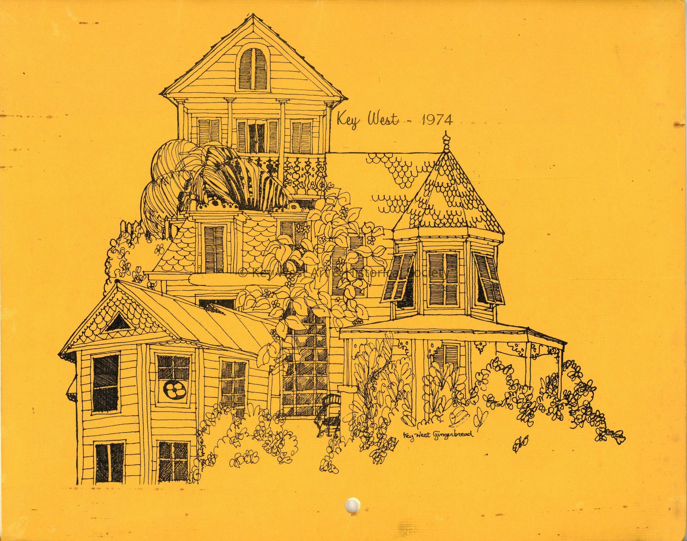 A 1974 year calendar designed by Melinda Blair featuring her drawings of architectural features and homes in Key West.Collection