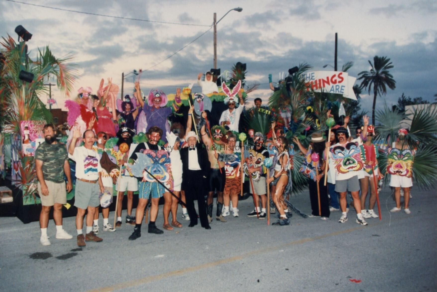 Capt. Tony with a group of unknown people standing next to a few floats.Collection