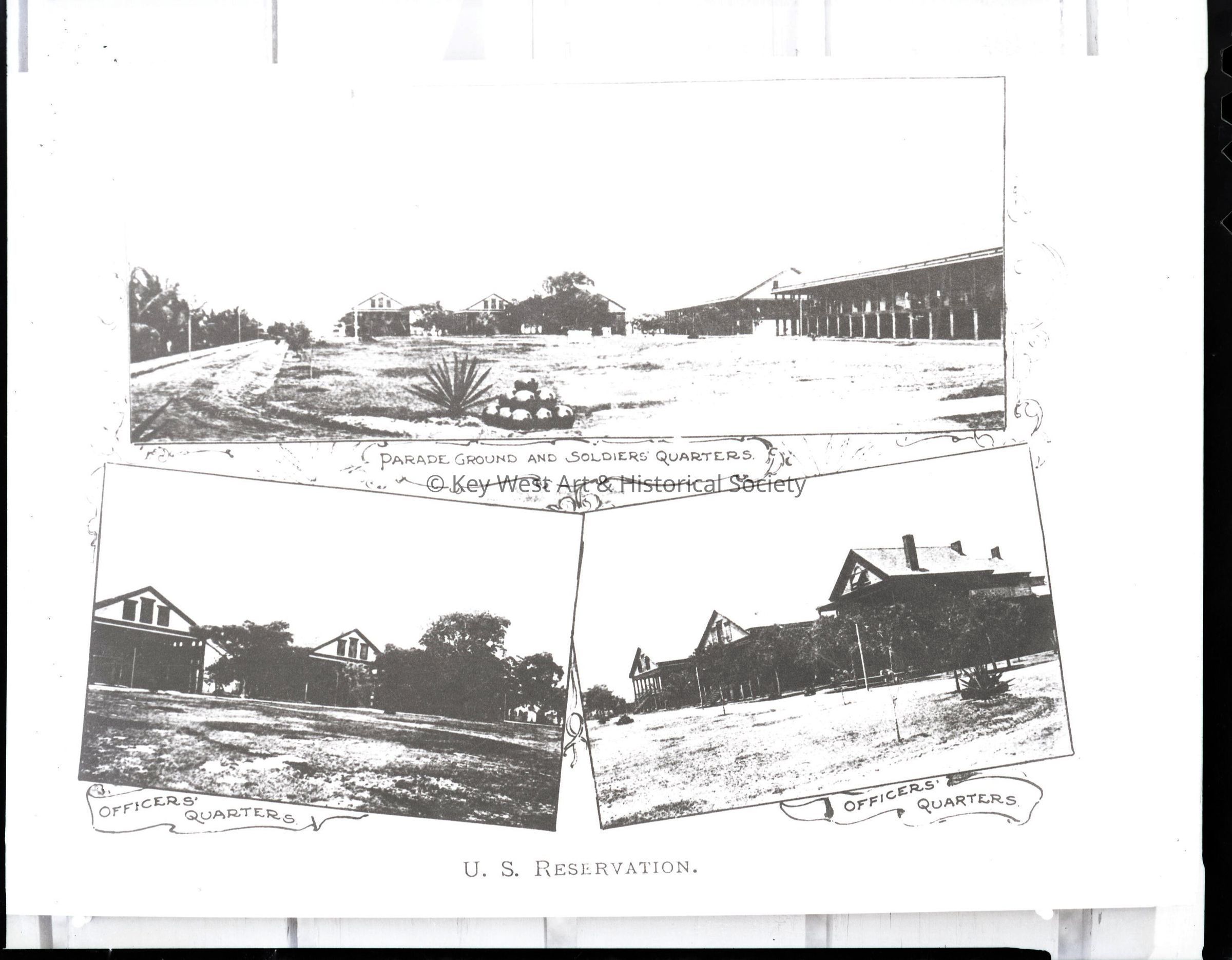 Black and white negative taken from an edition of Harper's Weekly with illustrations of the Key West Army Barracks, including three views of the parade grounds, soldiers' quarters and officers' quarters.Photograph Details