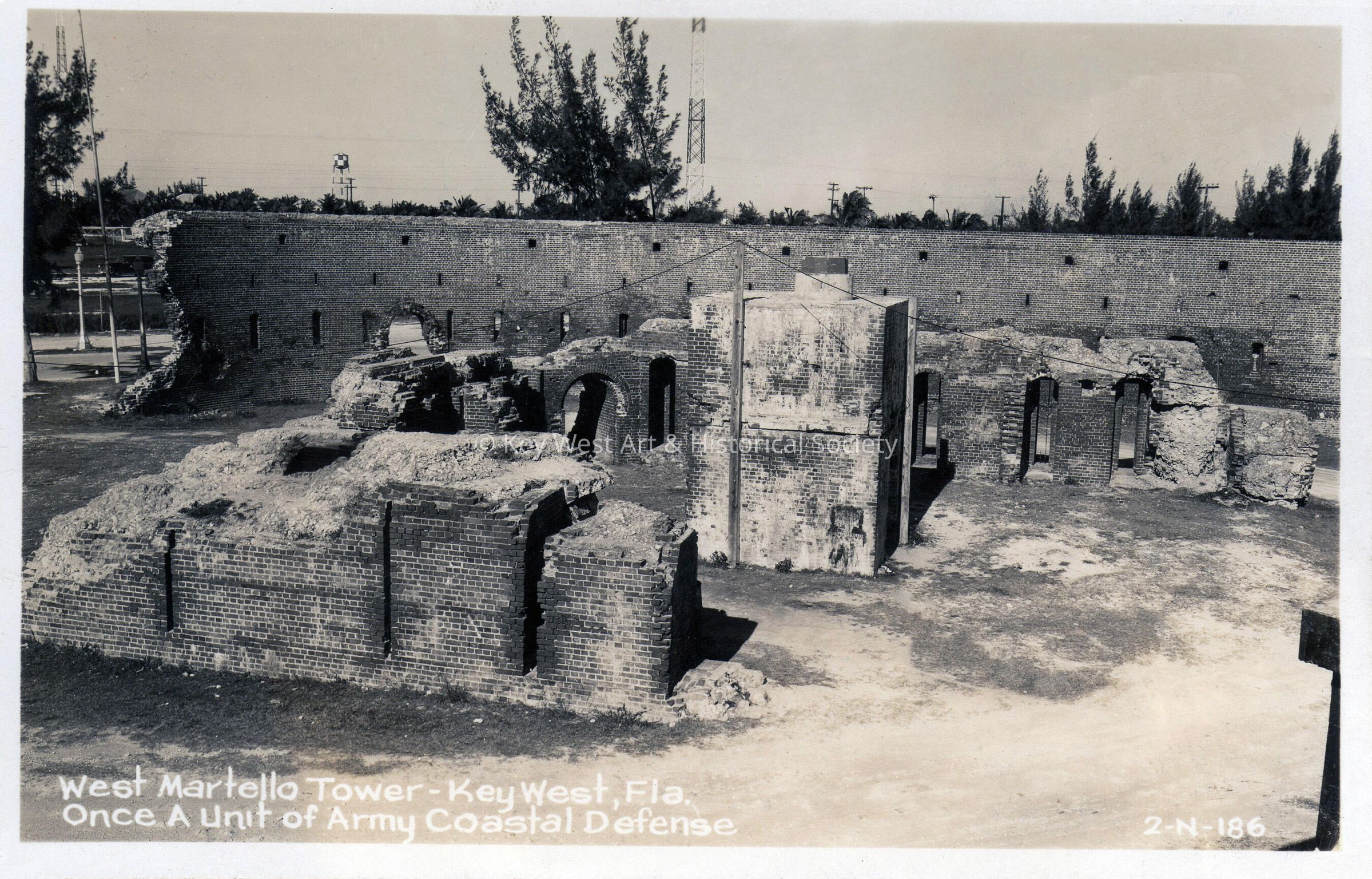 Postcard depicting the ruins of Fort West Martello.  The caption reads, ‘West Martello Tower, Key West, Florida.  Once a unit of Army coastal defense’.Subject Place