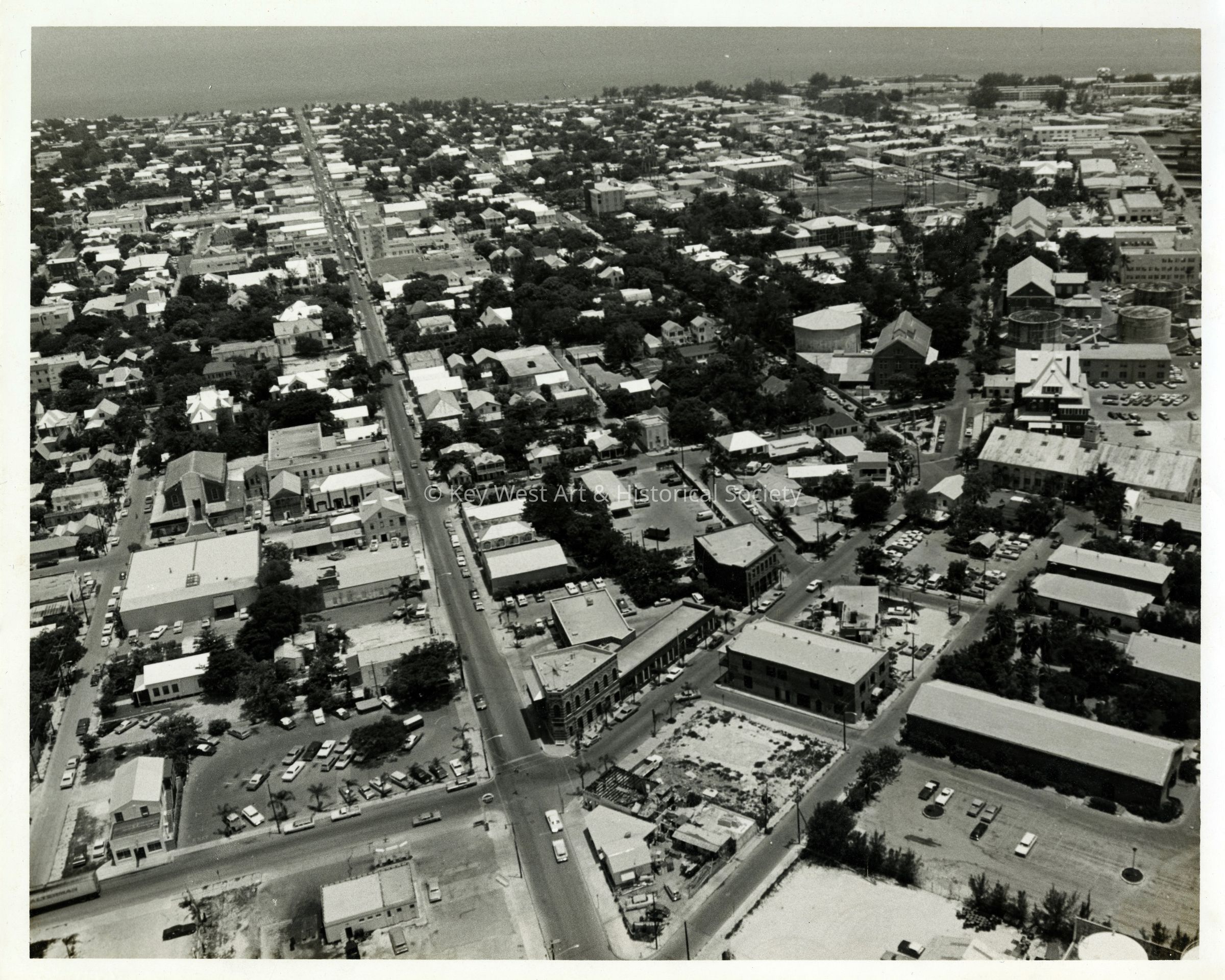 Black and white aerial view of Mallory Square, Key West, taken on June 11, 1970. Views of Front, Duval and Whitehead streets. The Custom House and Naval Storehouse (Building 1) are visible in the lower right corner.Photograph Details