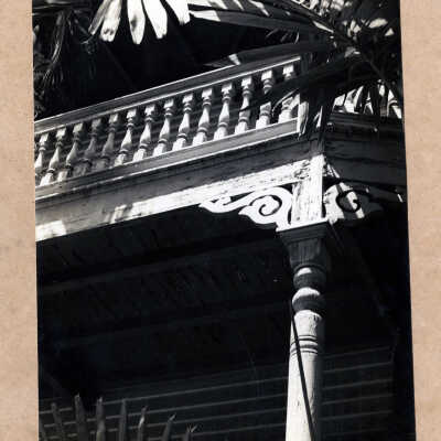 A black and white photograph of the gingerbread belonging to the Artist House, also known as the Otto House, located at 534 Eaton Street, taken by Sheila Shaw.Photograph Details