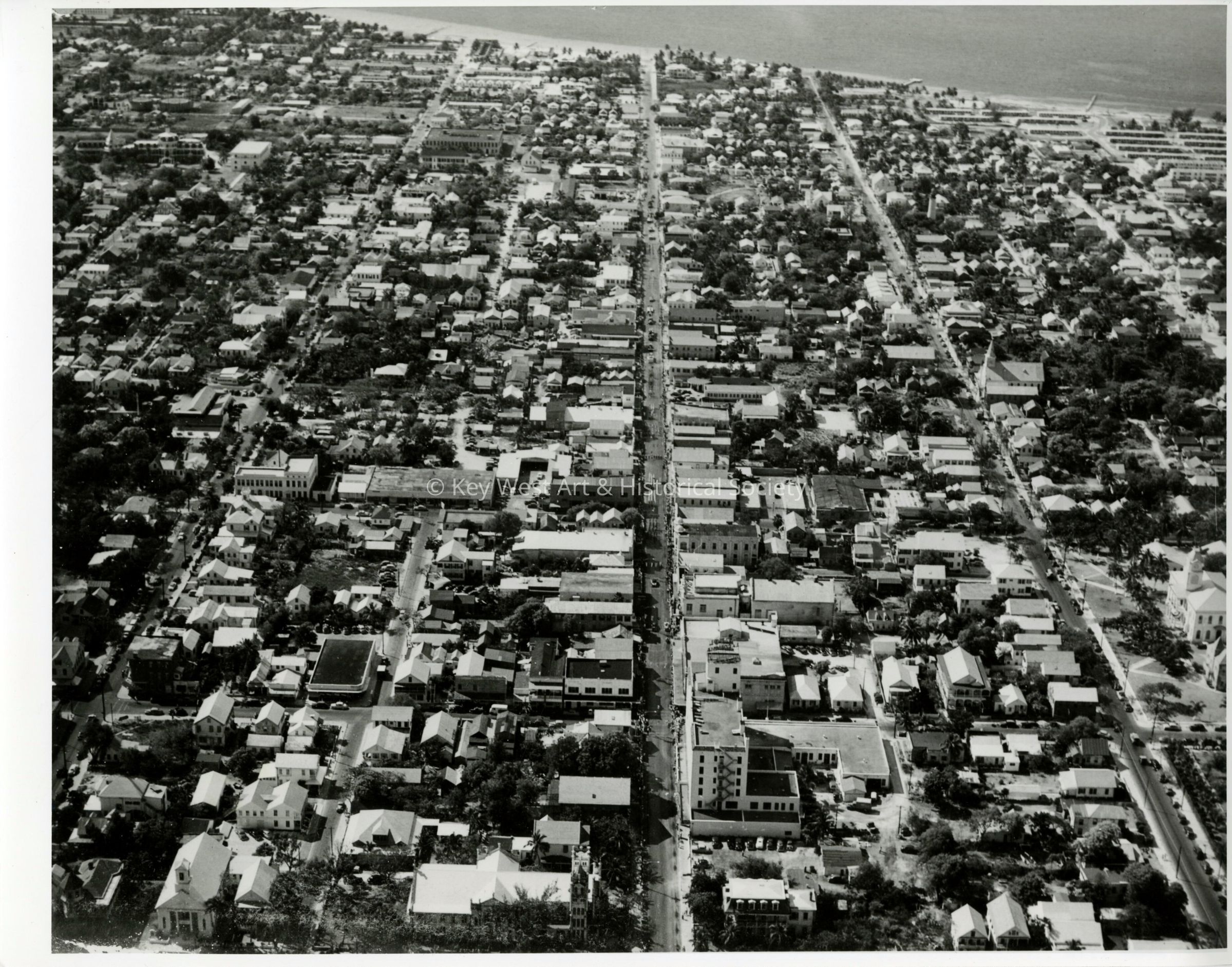 Black and white aerial photograph of Duval Street taken during the Armed Forces Day Parade.