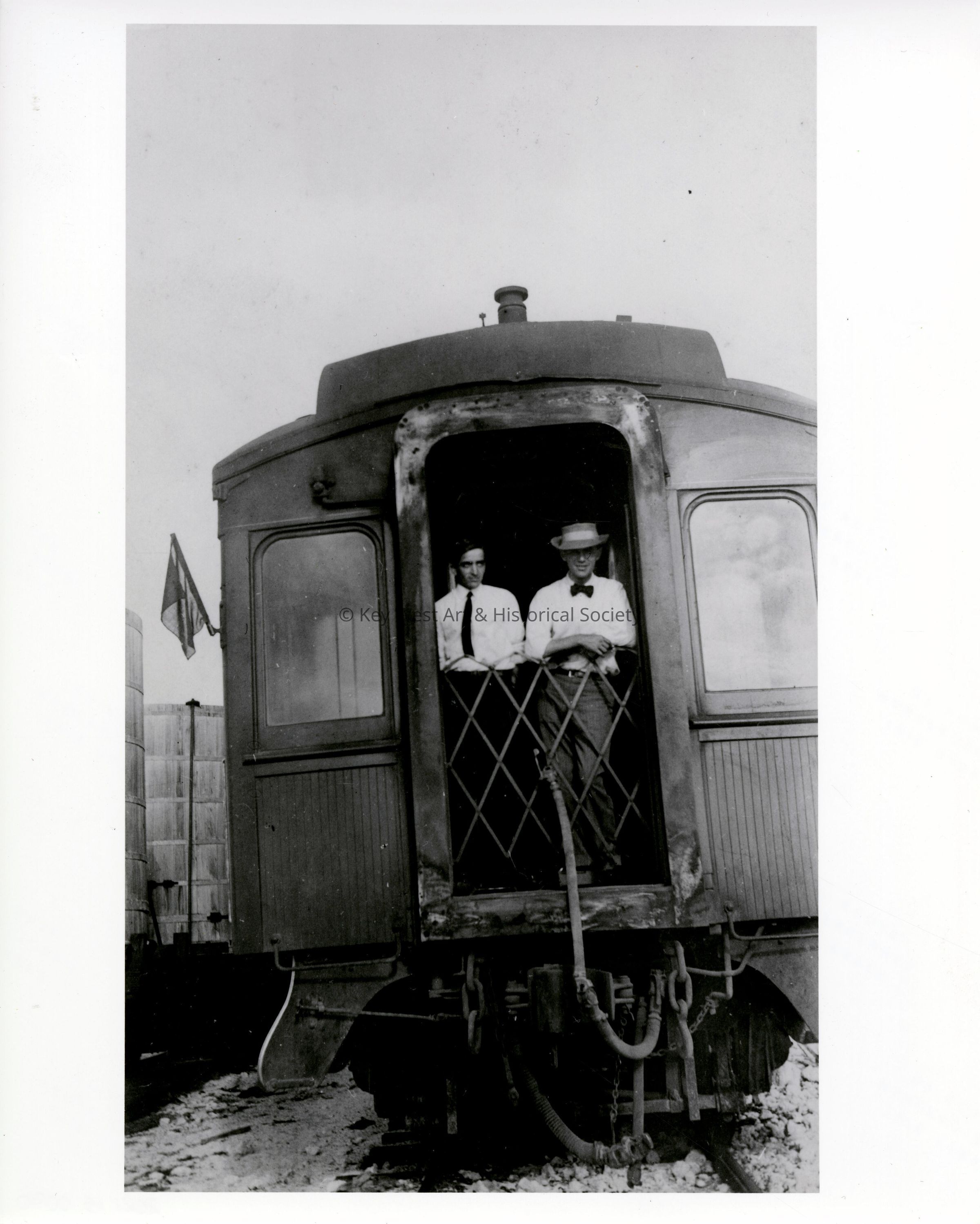 Black and white photograph of two unknown men standing at the rear of a Florida East Coast Railway traincar.