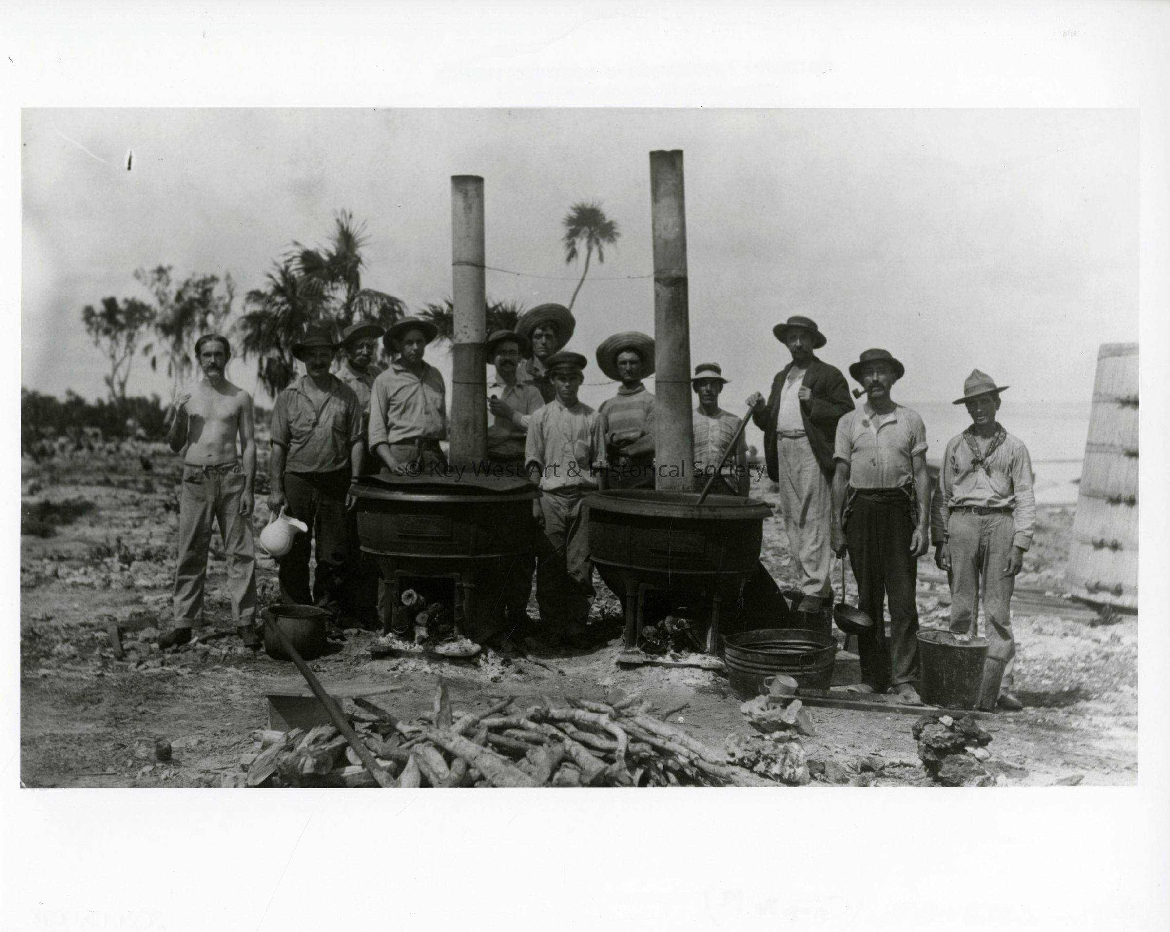 Black and white photograph of Florida East Coast Railway construction workers alongside cooking cauldrons at Camp 12 in Stock Island.