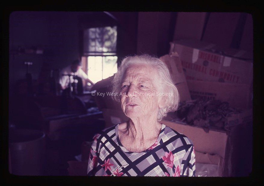 35mm color slide of Almead Bell and her husband Willard Bell in The Tropical Cigar Factory. Almead is in the foreground standing in front of cardboard boxes. Willard is in the background at his worktable. The factory was located at the corner of Fleming and Margaret streets.
