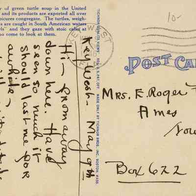 Postcard depicting arrival and unloading of a turtle boat, Key West, Florida. The only cannery of green turtle soup in the United States is in Key West, and its products are exported all over the world wherever epicures congregate. The turtles, weighting 300 to 400 pounds, are caught in South American waters and penned in "crawls" and they gaze with stoic calm at the strange people who come to look at them.Collection