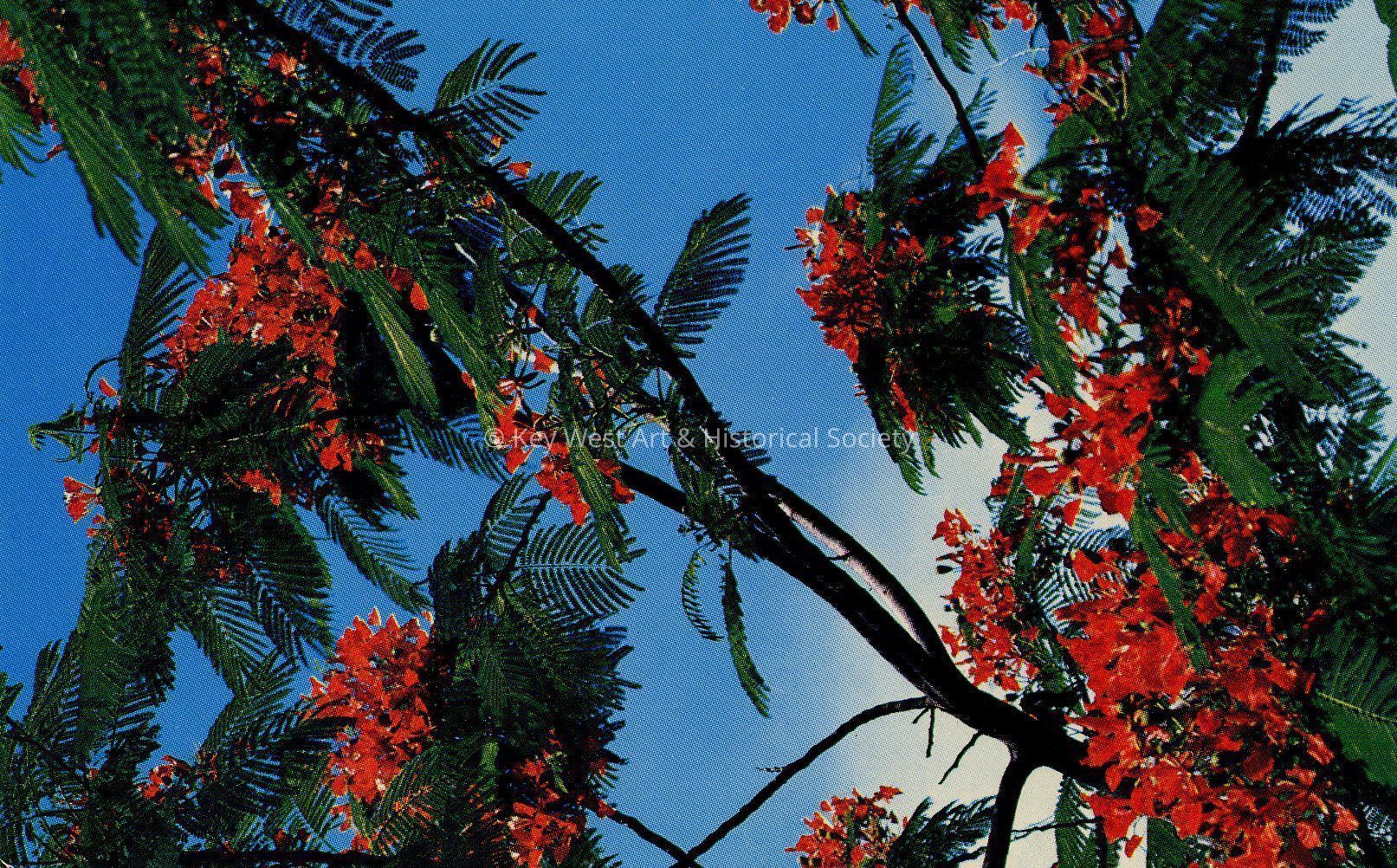 Postcard depicting the branches, leave and flowers of a Royal Poinciana tree in bloom.  Notation on verso, 'Royal Poinciana.  The brilliant blossoms of the Poinciana - or 'Flame' - Tree are a familiar and beautiful part of the scenery of Florida.'Subject Place