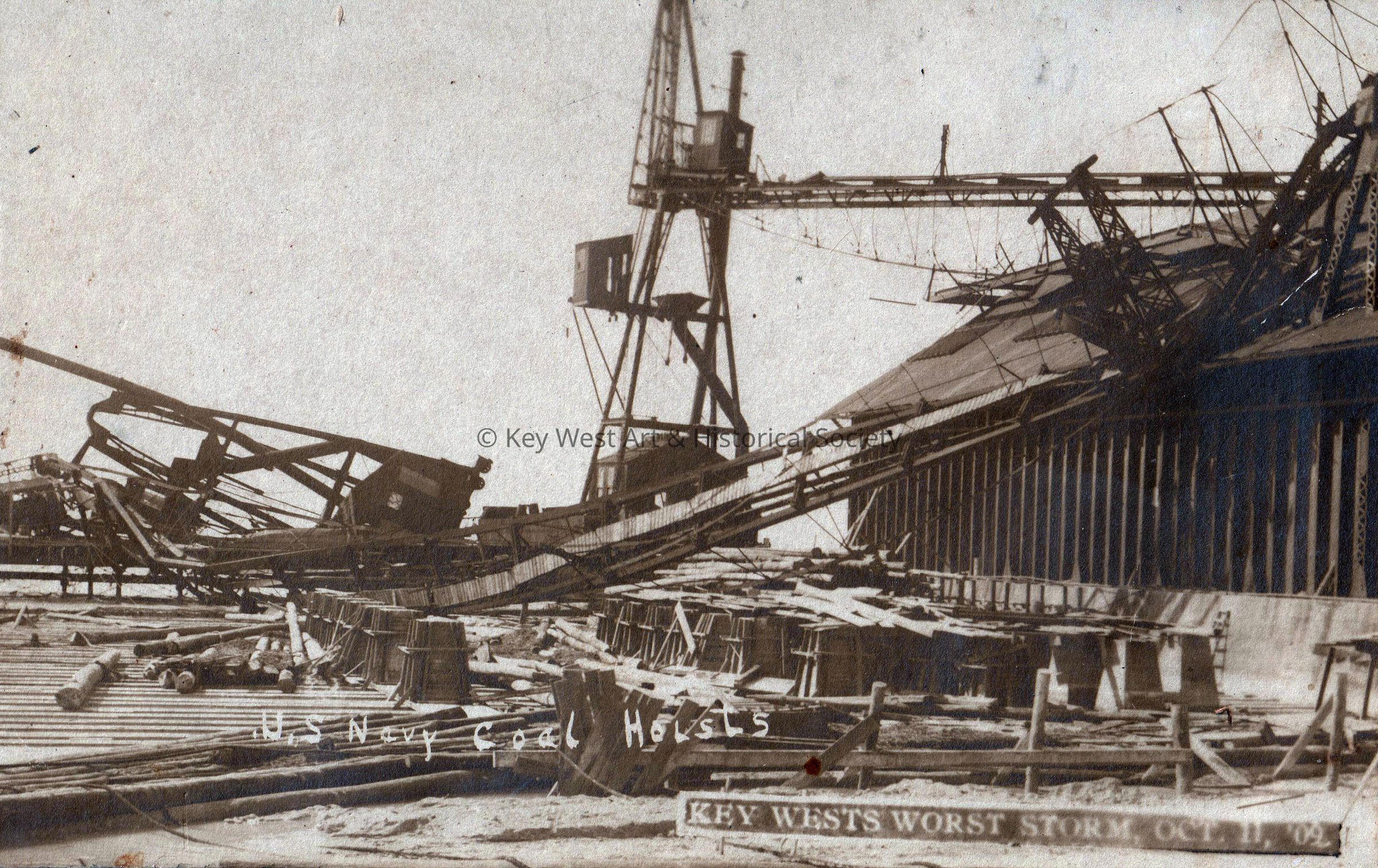 Rubble and leaning cranes, damage to the Navy coal hoists, on October 11, 1909.Collection