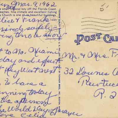 Postcard depicting Saint Paul's Episcopal Church with the harbor in the background in Key West, Florida. This church is located on the corner of Duval and Eaton Street.Collection