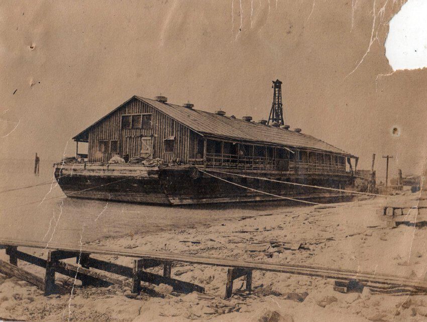 A houseboat used as quarters for workmen constructing the railroad, circa 1906.Photograph Details