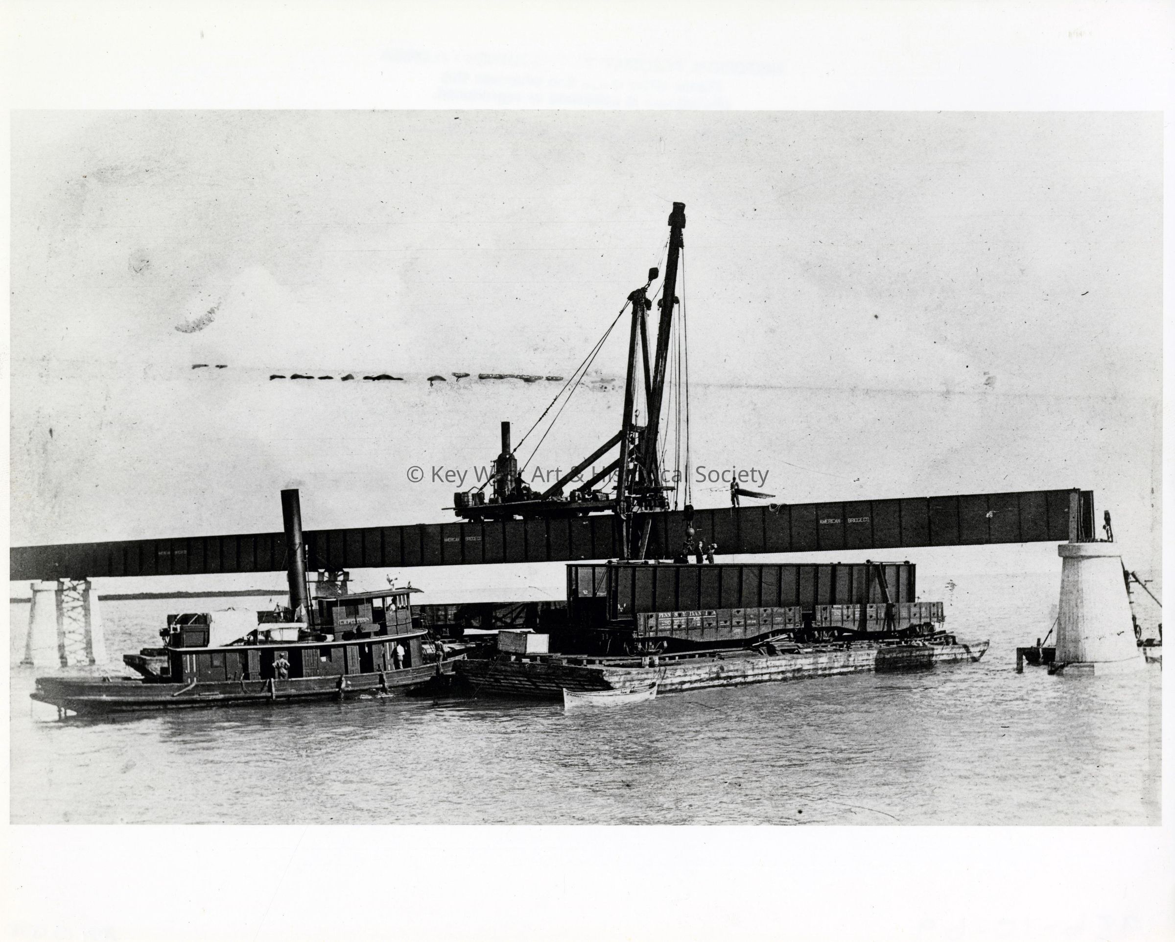 Black and white photograph of Florida East Coast Railway construction workers securing spans on the Seven Mile Bridge.