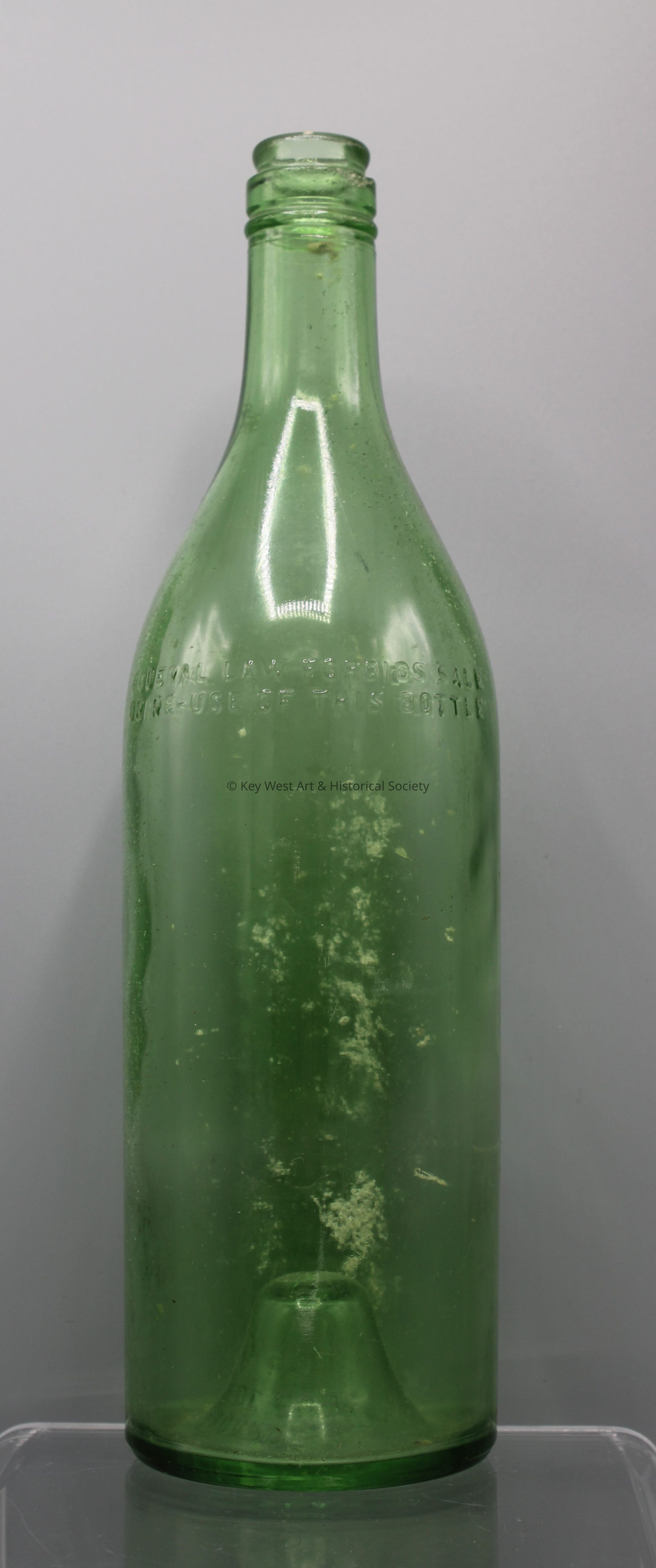 Green glass bottle with a tubular shape with a tapered neck and embossing on the upper third (1/3) reading 'Federal Law Forbids Sale / Or Re-Use Of This Bottle.' The base of the bottle is embossed with '65 (logo) 43' below this are the words 'Cia Ron Bacardi S.A. / Santiago De Cuba' that have been embossed upside down when compared to the other lettering.Use