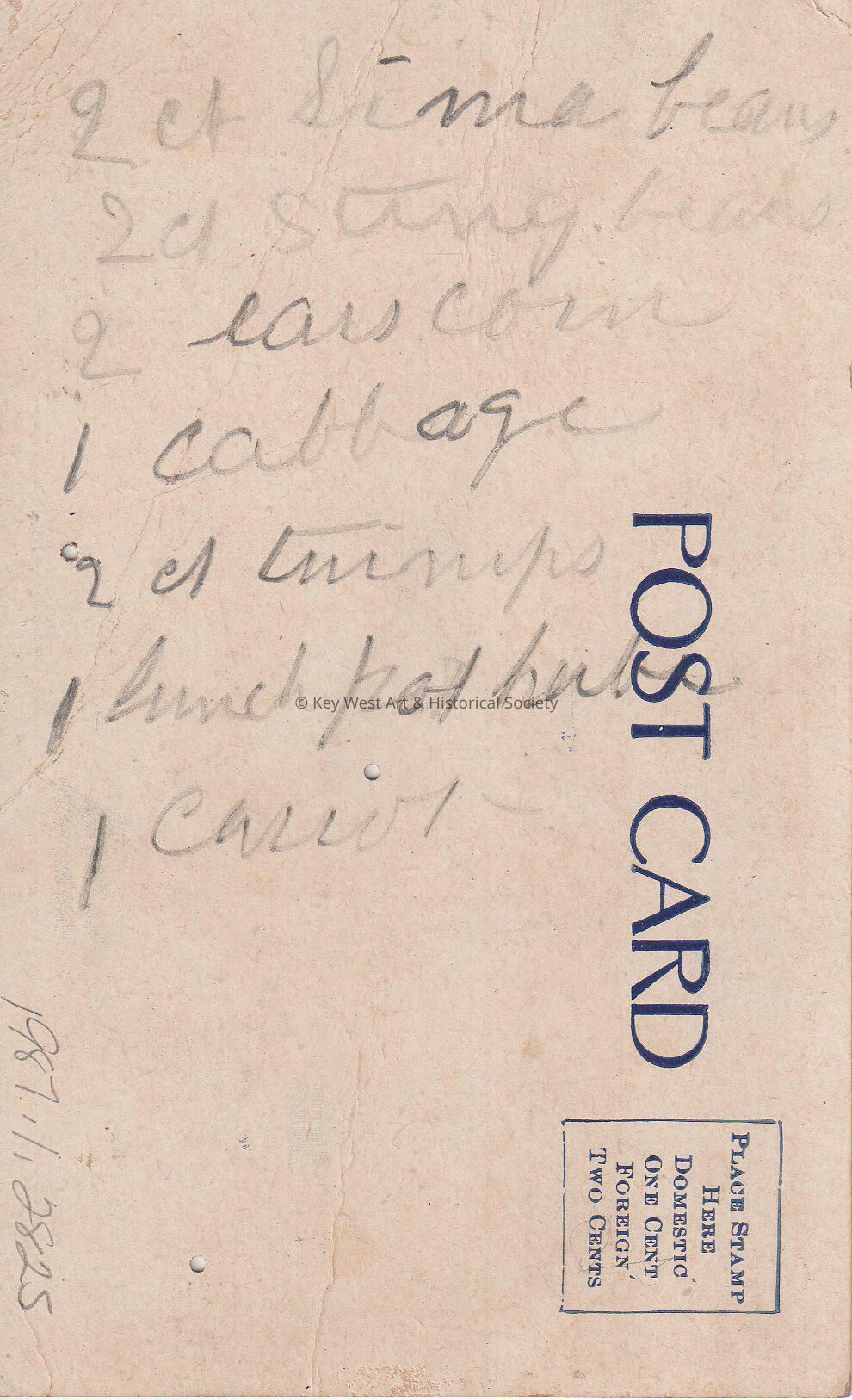 Postcard depicting cartoon of a man washing his face in a toilet rather than the sink.  The caption reads, ‘When Reuben comes to Atlantic City’.  The note on the verso reads, '2 cups lima beans, 2 cups string beans, 1 cabbage, 2 cups turnips, 1 bunch pot herbs, and 1 carrot.'Collection