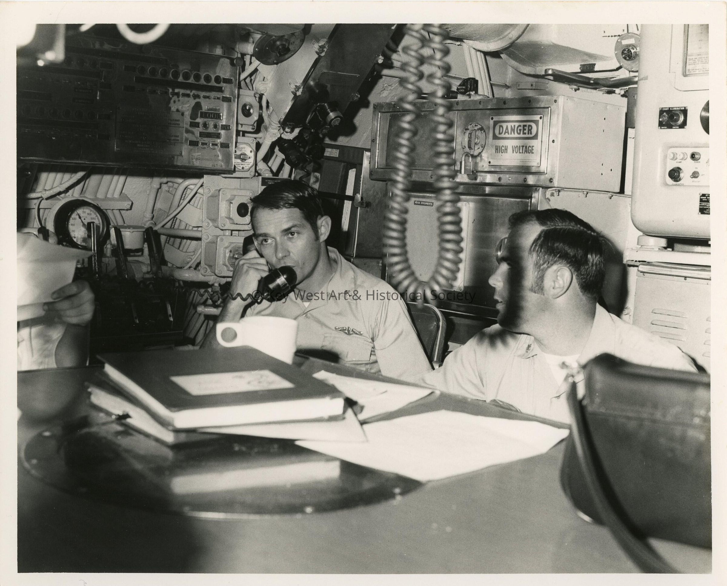 A military man talking on the telephone in a control room, with 2 other military men sitting near himCollection