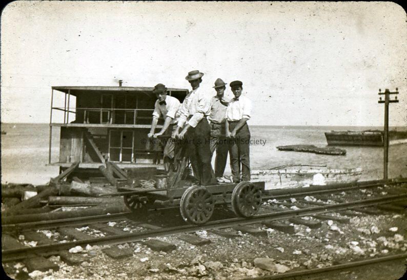 Black and white 35mm slide of four men on a Florida East Coast Railway handcar near Knights Key. They are identified as (l-r) Carlton Corliss, Sweeting, Paturzo and Spalding.
