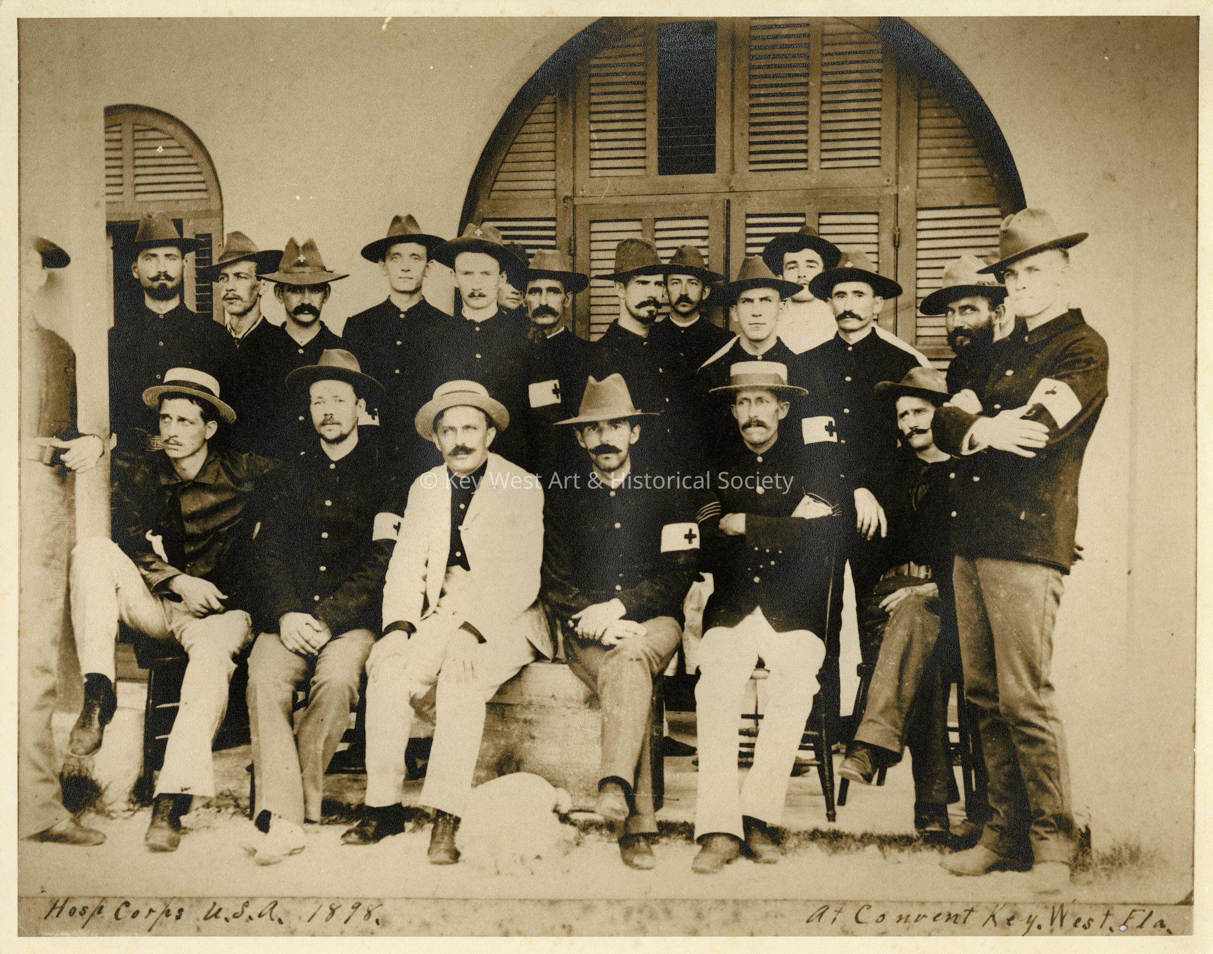 Black and white photograph of the Army Hospital Corps at the Convent of Mary Immaculate during the Spanish-American War.