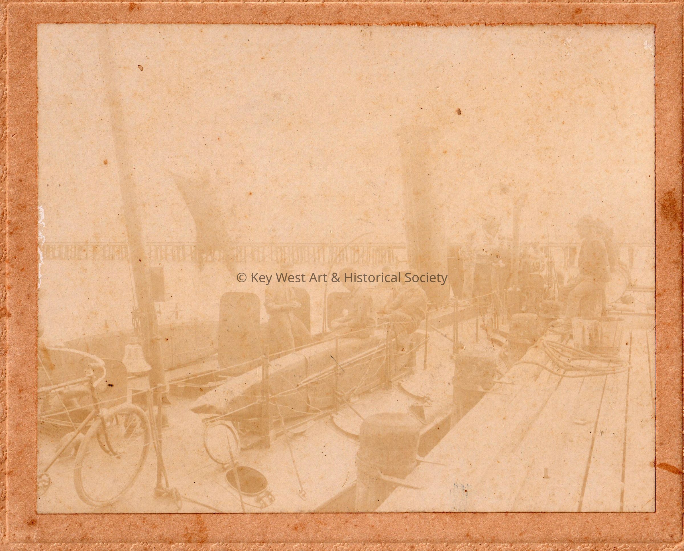 Sepia photograph of sailors on the deck of the torpedo boat U.S.S. ERICSSON docked at Naval Station Key West during the Spanish-American War. As war with Spain approached, ERICSSON patrolled the Florida Keys, intensified her training operations, and carried messages for the increasing number of the fleet present in the area. She continued this duty after the opening of the war, then on 22 April 1898 began a blockade patrol between Havana and Key West.Photograph Details