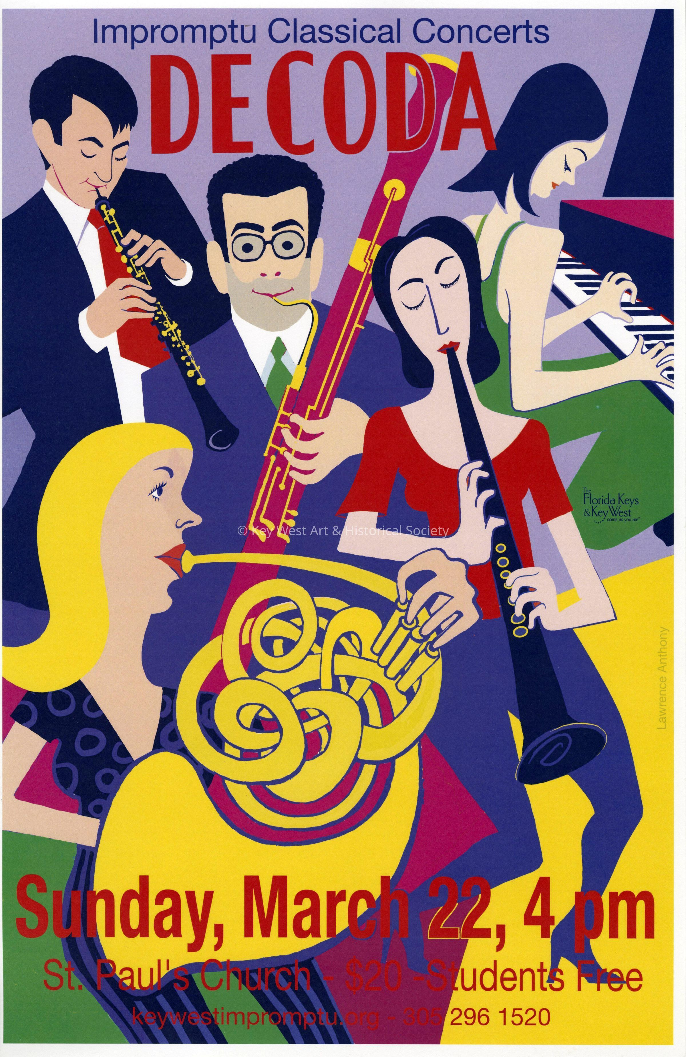 An advertising poster for Impromptu Classical Concerts featuring Decoda. The concert took place on March 22, 2015 at St. Pauls Church in Key West. The poster was designed by Lawrence Anthony.Collection