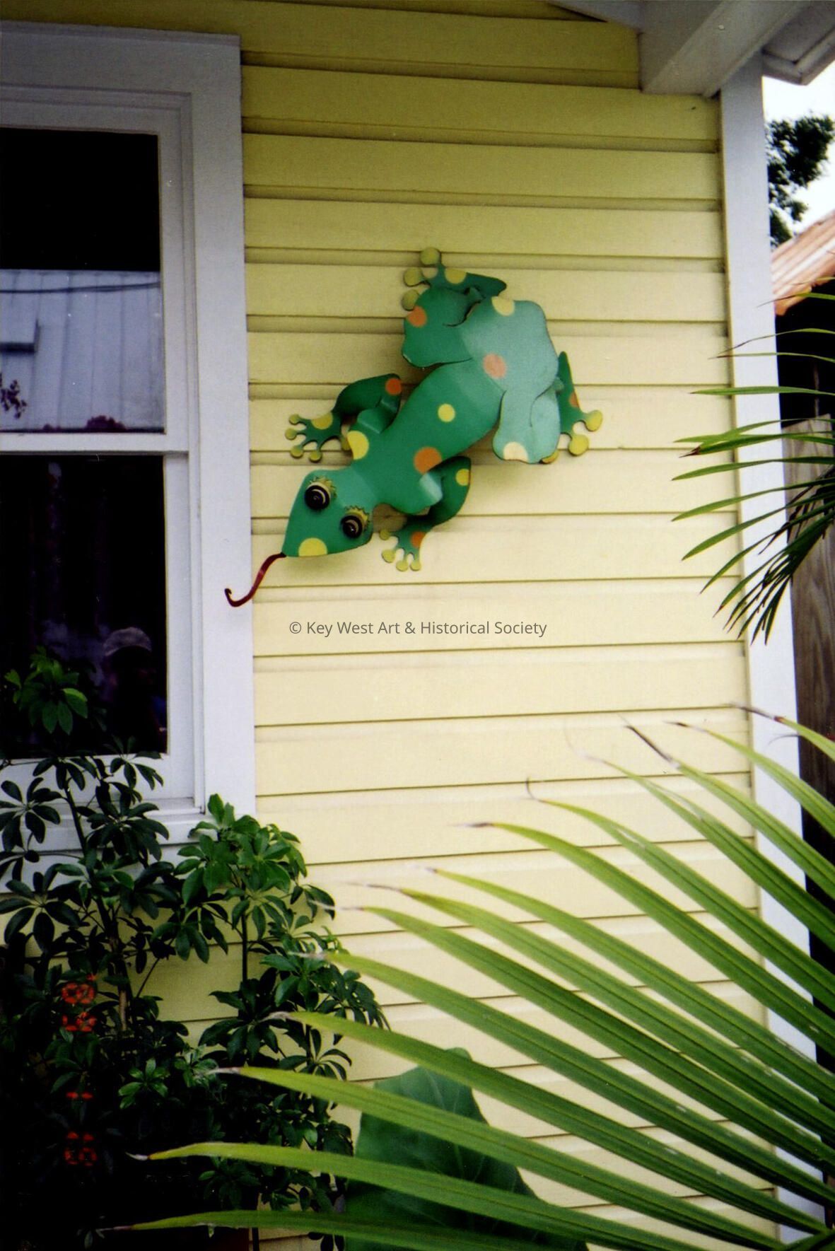 Color photograph taken by historian James M. Goode of a metal sculpture in the shape of a gecko on the side of a house during a trip to Key West in February 2001. Printed from Roll 6.Photograph Details
