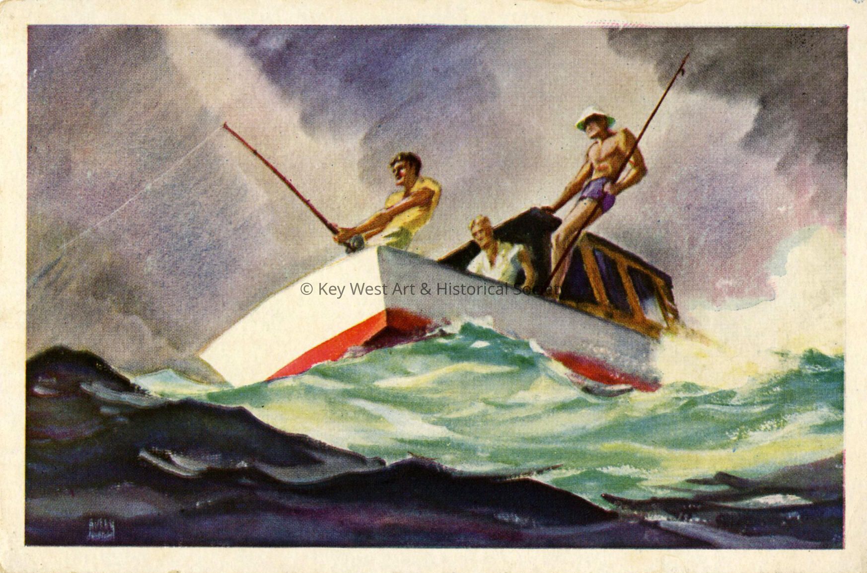 Postcard depicting men on a boat deep sea fishing. Notation on verso, 'Deep Sea Fishing Key West, Florida. Original water color by Avery Johnson - in the collection of the Key West Administration.'Subject Place
