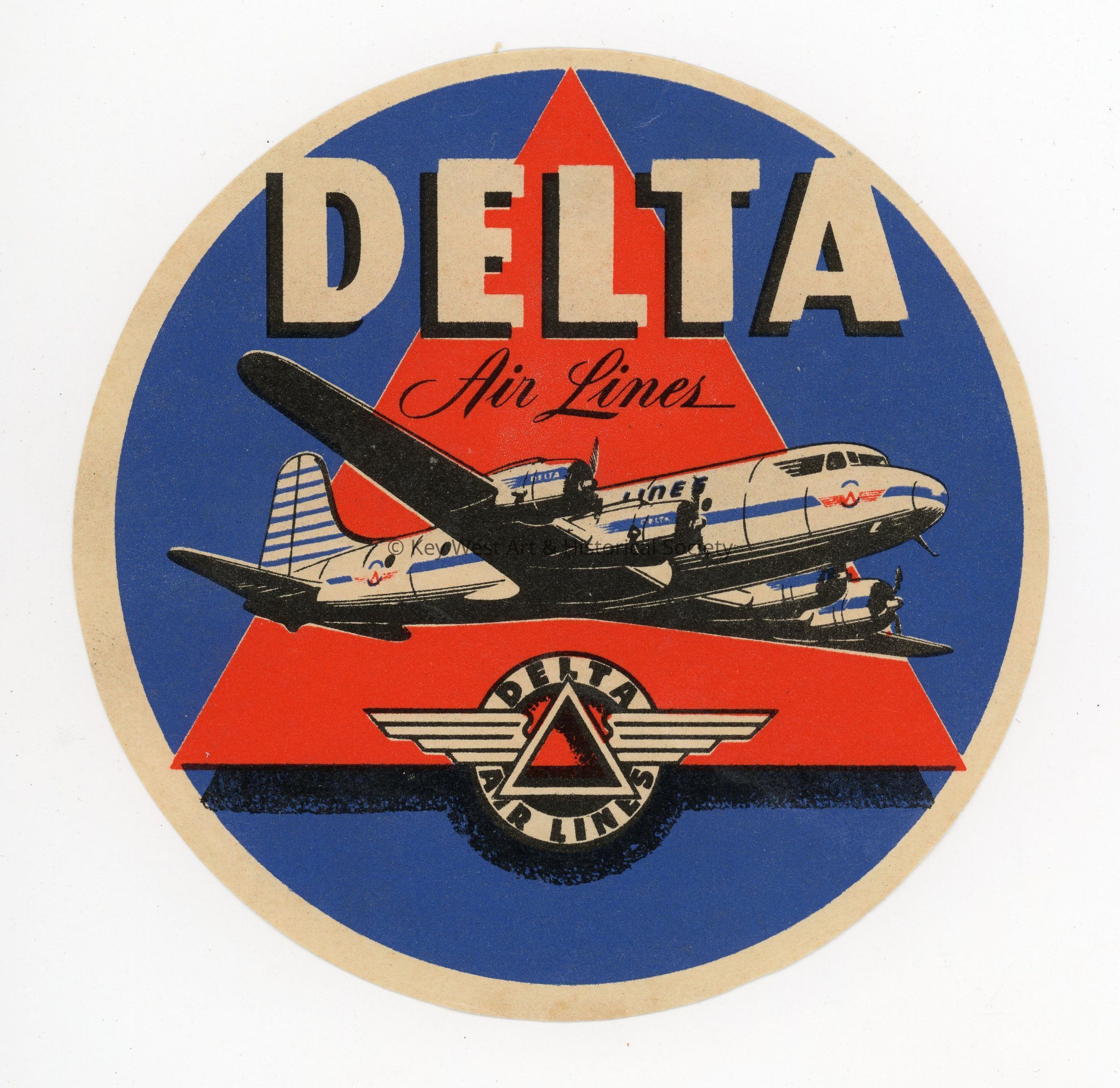 Red, white, and blue sticker with text reading 'DELTA Air Lines.' The sticker has plane midflight in the center with the Delta logo below. Shortly before Pan Am went bankrupt in 1991, Delta acquired many of their transatlantic routes.Collection