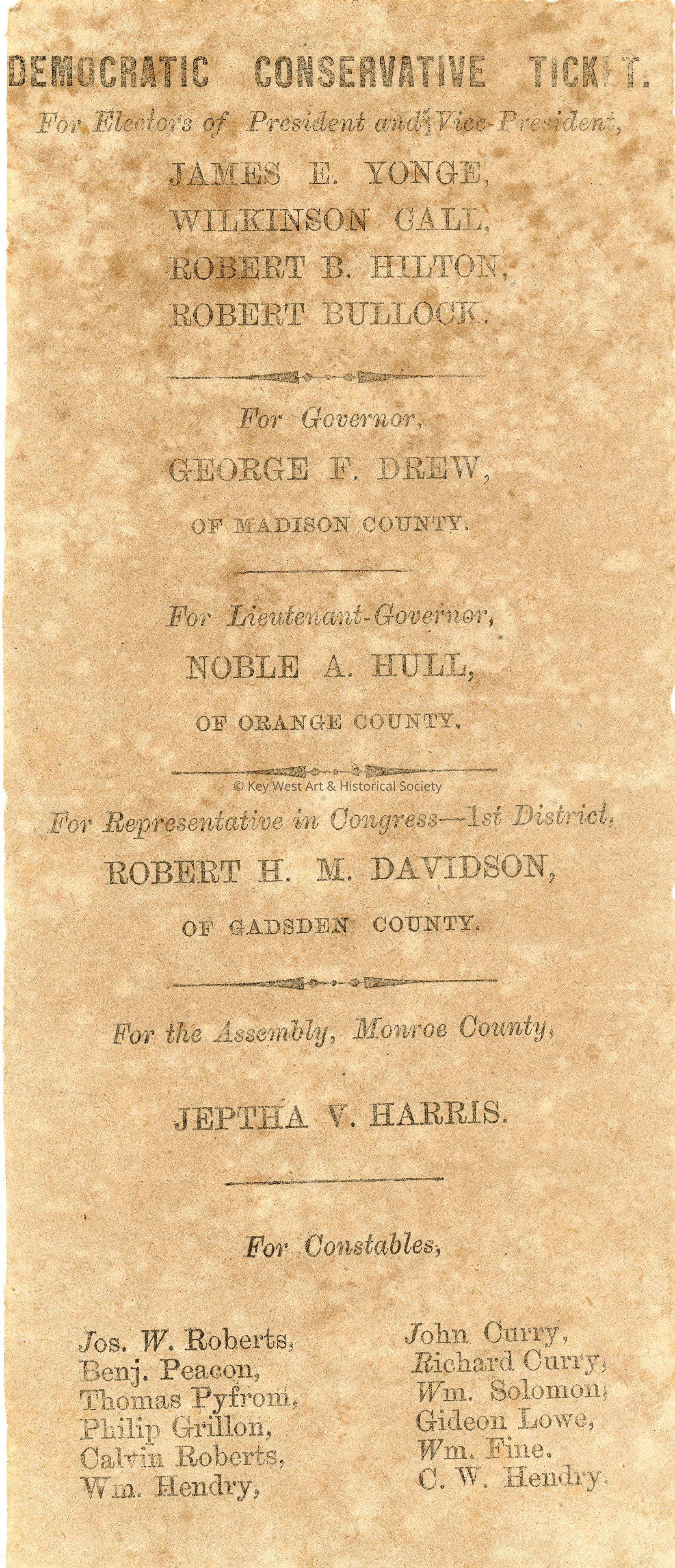 Thin paper with black text with the header 'DEMOCRATIC CONSERVATIVE TICKET.' The ticket lists the 1876 'Electors of President and Vice-President,' governor, lieutenant-governor, District One congressional representative, Monroe County Assembly, and constables.Collection