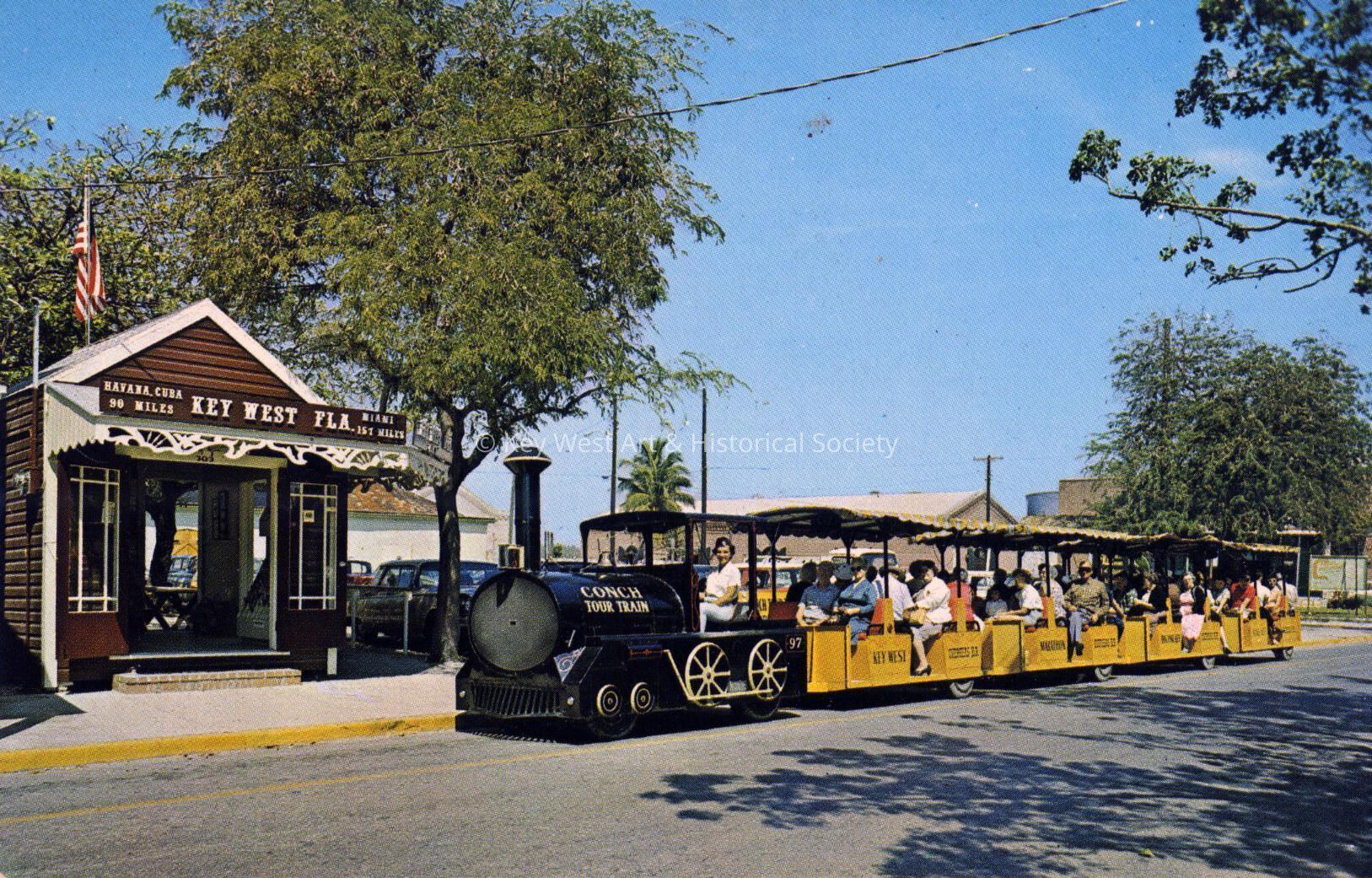Postcard depicting the Conch Tour Train at the Depot on Front Street. The description on the verso reads, 'Depot and Conch Tour Train, Key West, Florida. The famous 64 passenger Conch Tour Trains operate several conducted lecture tours daily. Passing over 60 points of interest, these sightseeing trains run from the Atlantic Ocean to the Gulf of Mexico. This historic old town is the nation's southernmost city and the only tropical city in the continental U.S.A.'Subject Place