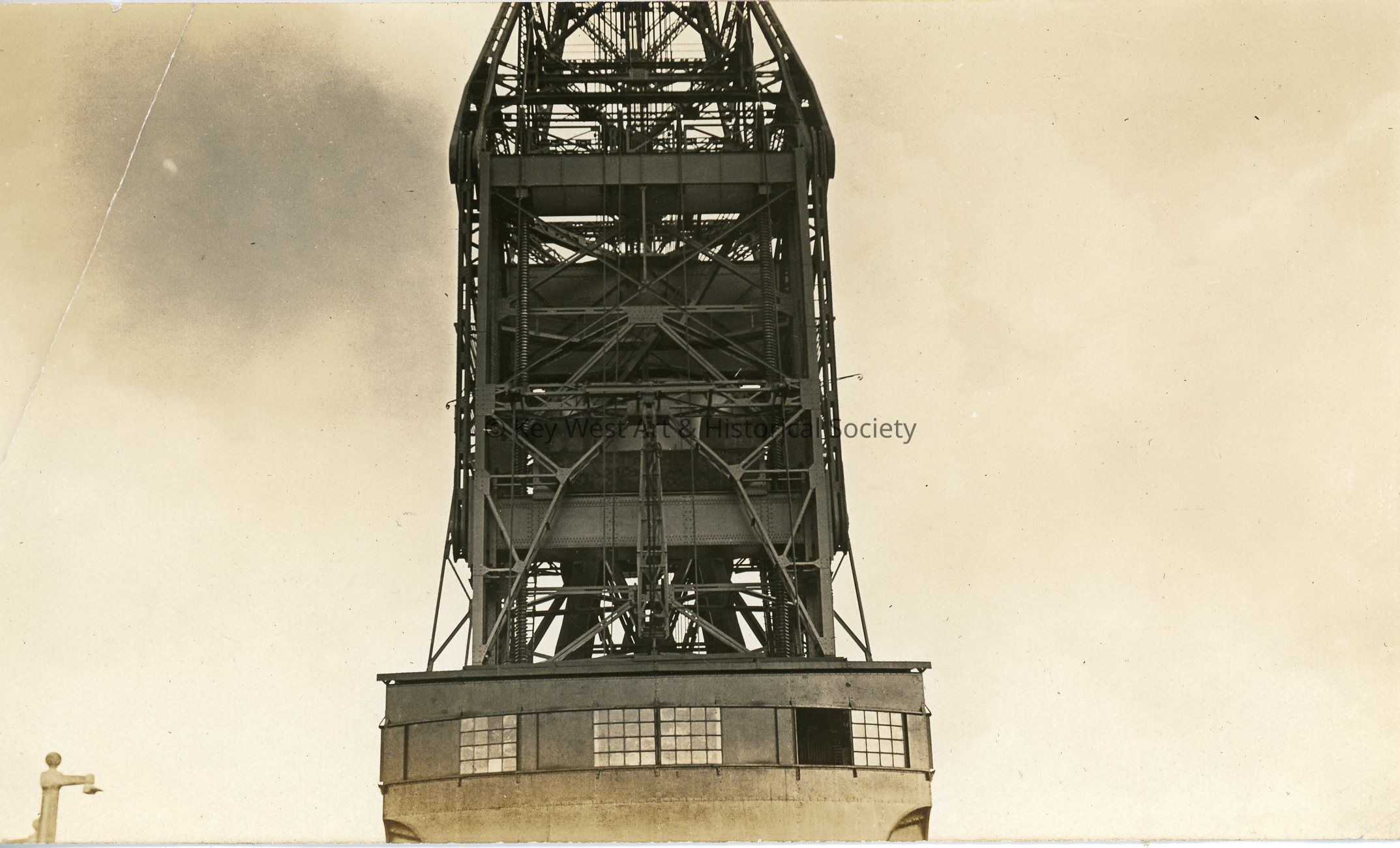 Black and white photograph depicting the construction of the Panama Canal. The photograph shows a large crane as seen from below and from the back. This photo was likely taken at the Gatun Locks. The photograph was designed to be attached to a postcard backing.