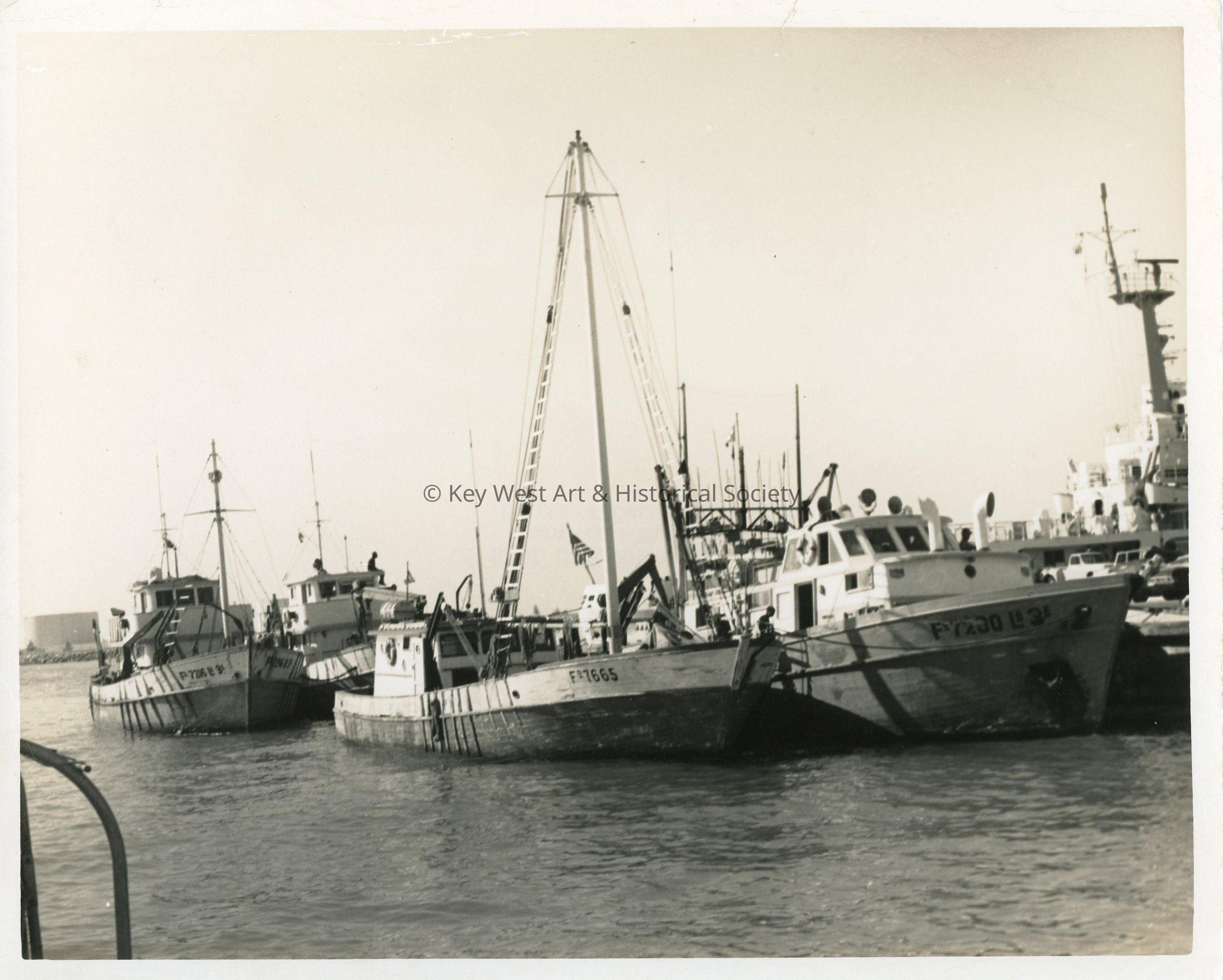 Black and white photograph of a vessel carrying Cuban refugees at Naval Station Key West during the Mariel Boatlift.