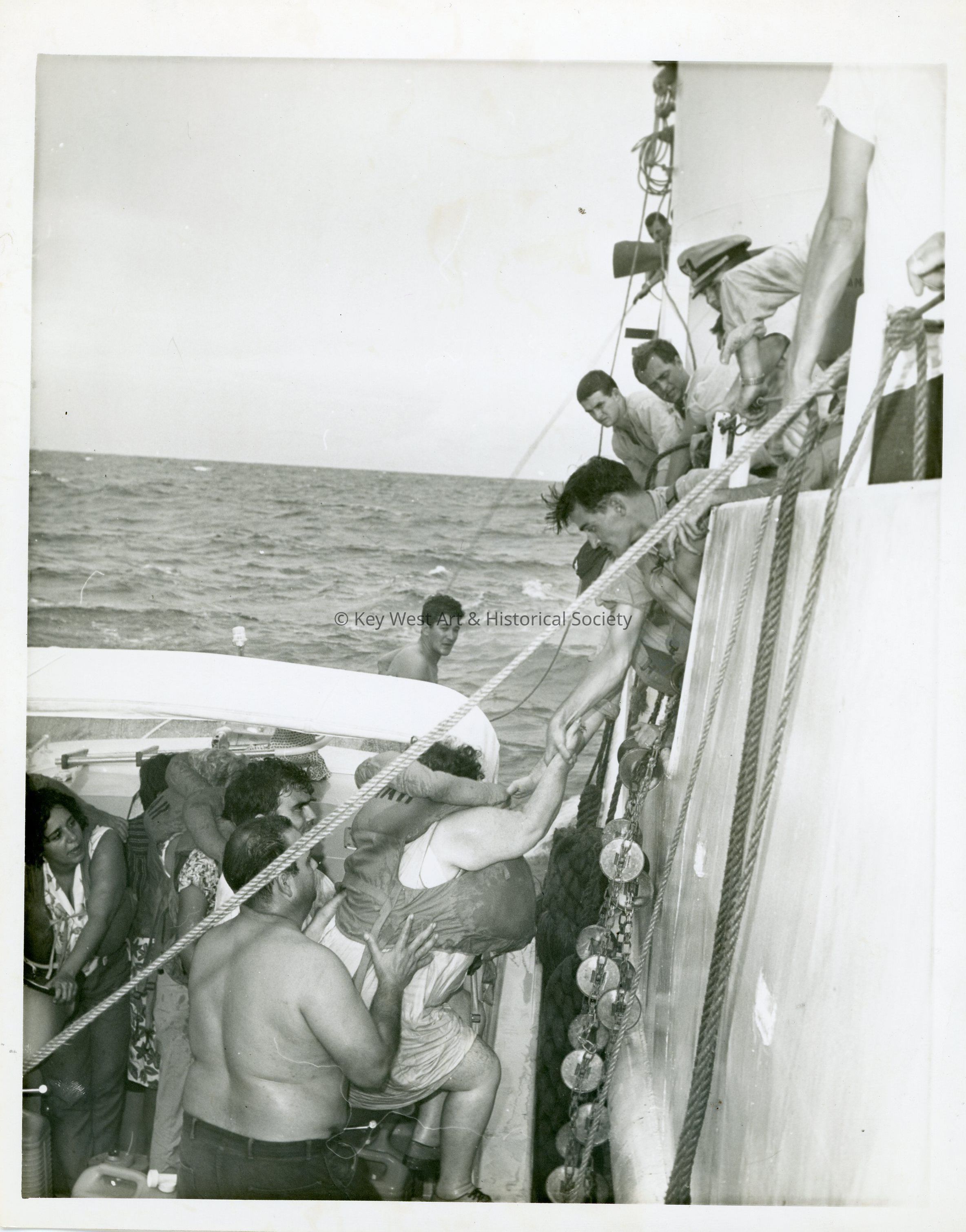 Black-and-white photograph of U.S. Navy personnel assisting female Cuban refugees aboard a ship from a small watercraft during the Mariel Boatlift.