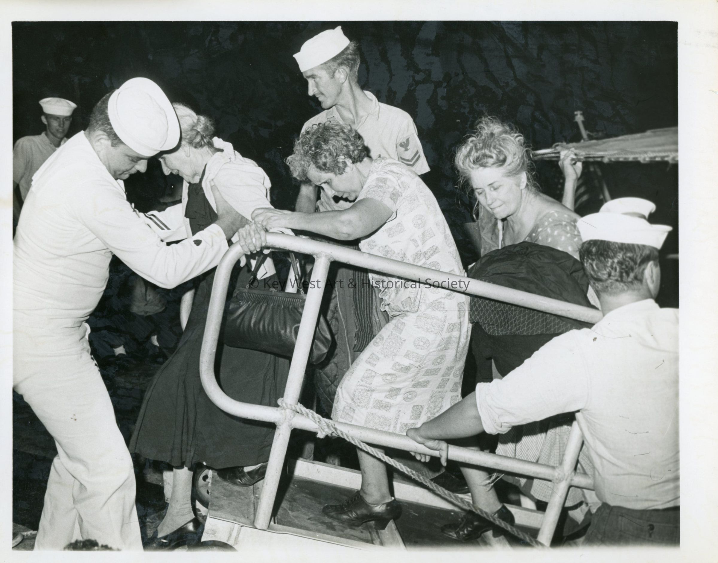 Black-and-white photograph of U.S. Navy personnel assisting female Cuban refugees disembarking during the Mariel Boatlift.