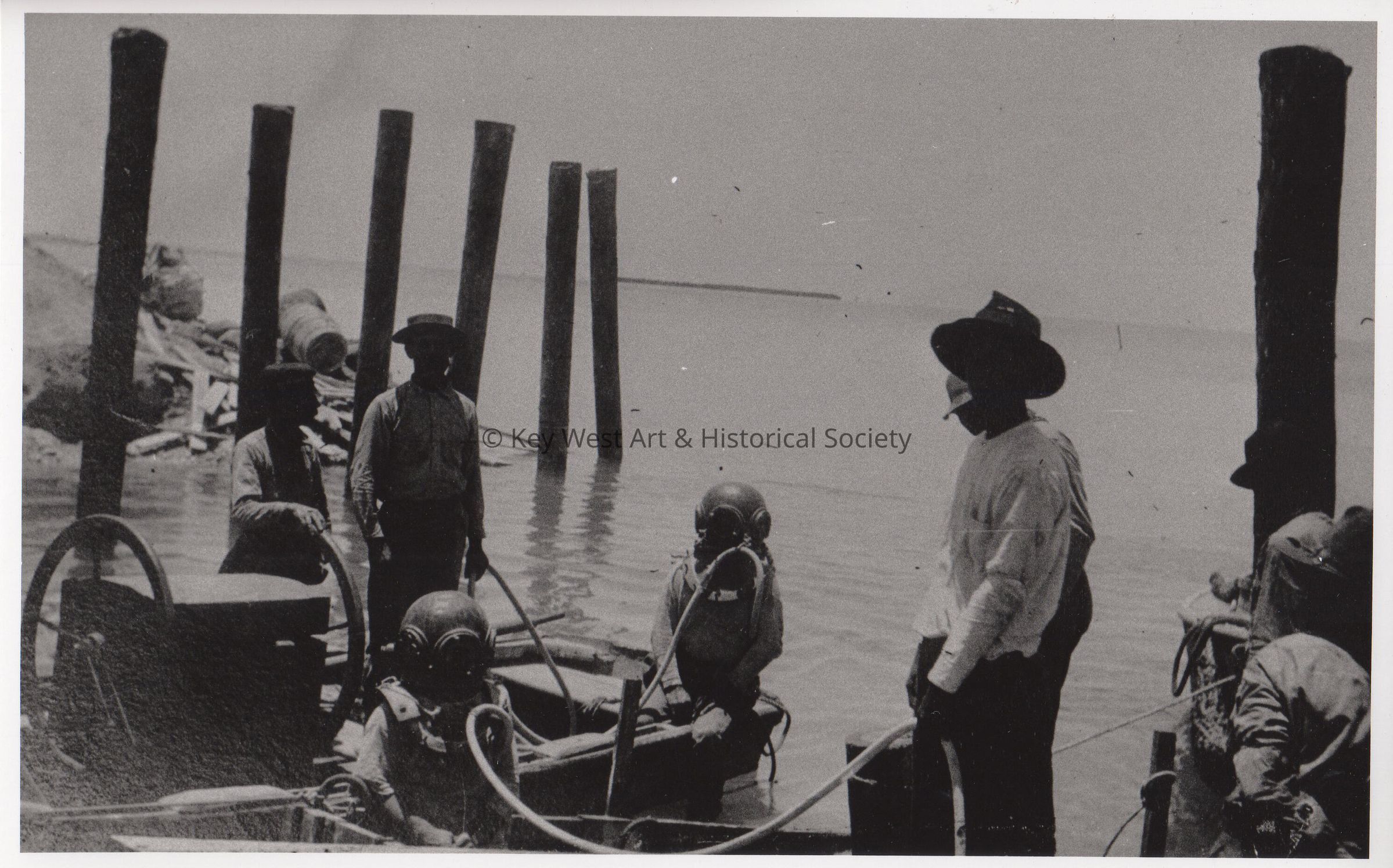 Black and white photograph of hard hat divers working on the bridge piers for the Florida East Coast Railway Company.