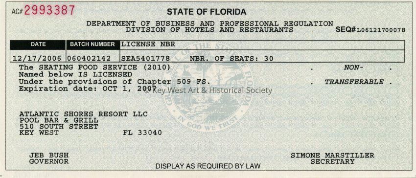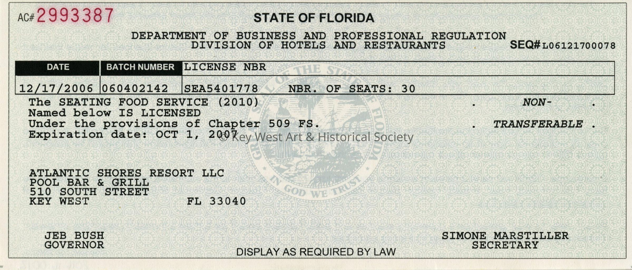 Division of Hotels and Restaurants License for Atlantic Shores Resort at 510 South Street for seated food service effective December 17, 2006, issued by the State of Florida.Collection