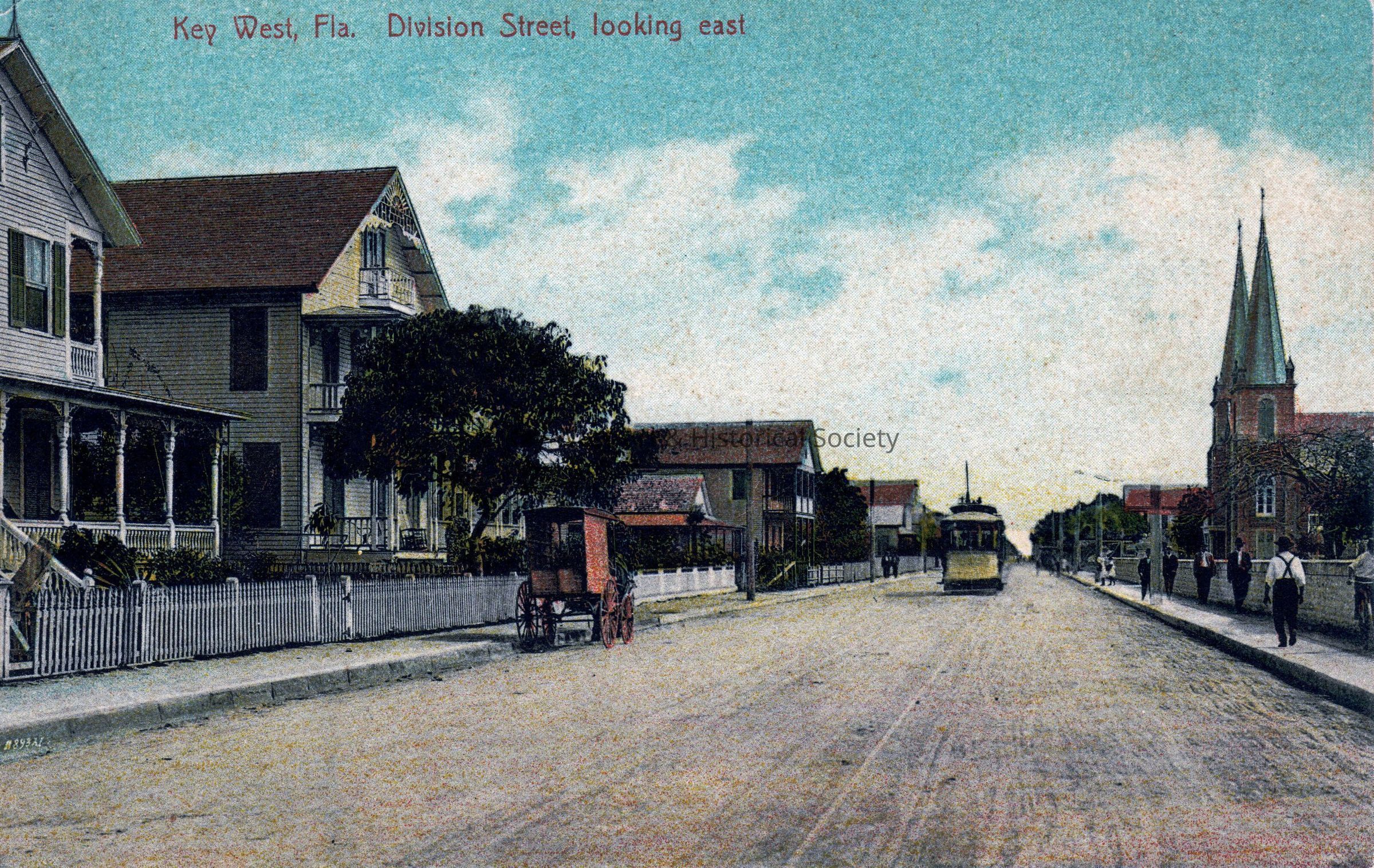 Postcard depicting a streetcar, carriage, and people on Division Street (now Truman Avenue) in Key West, Florida. The caption reads, ‘Key West, Florida, Division Street Looking east’.Collection