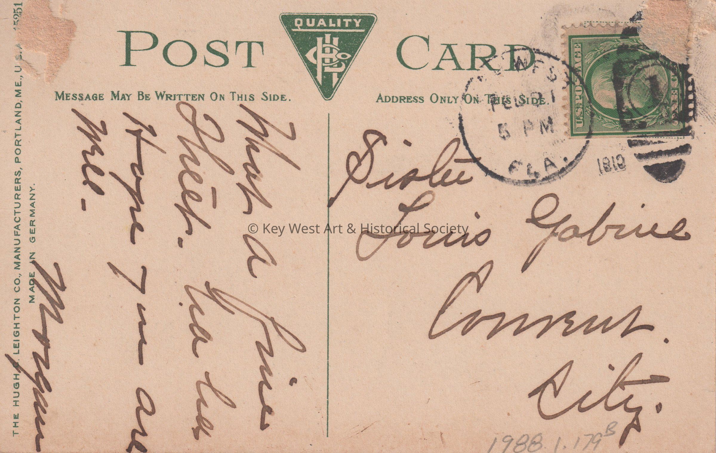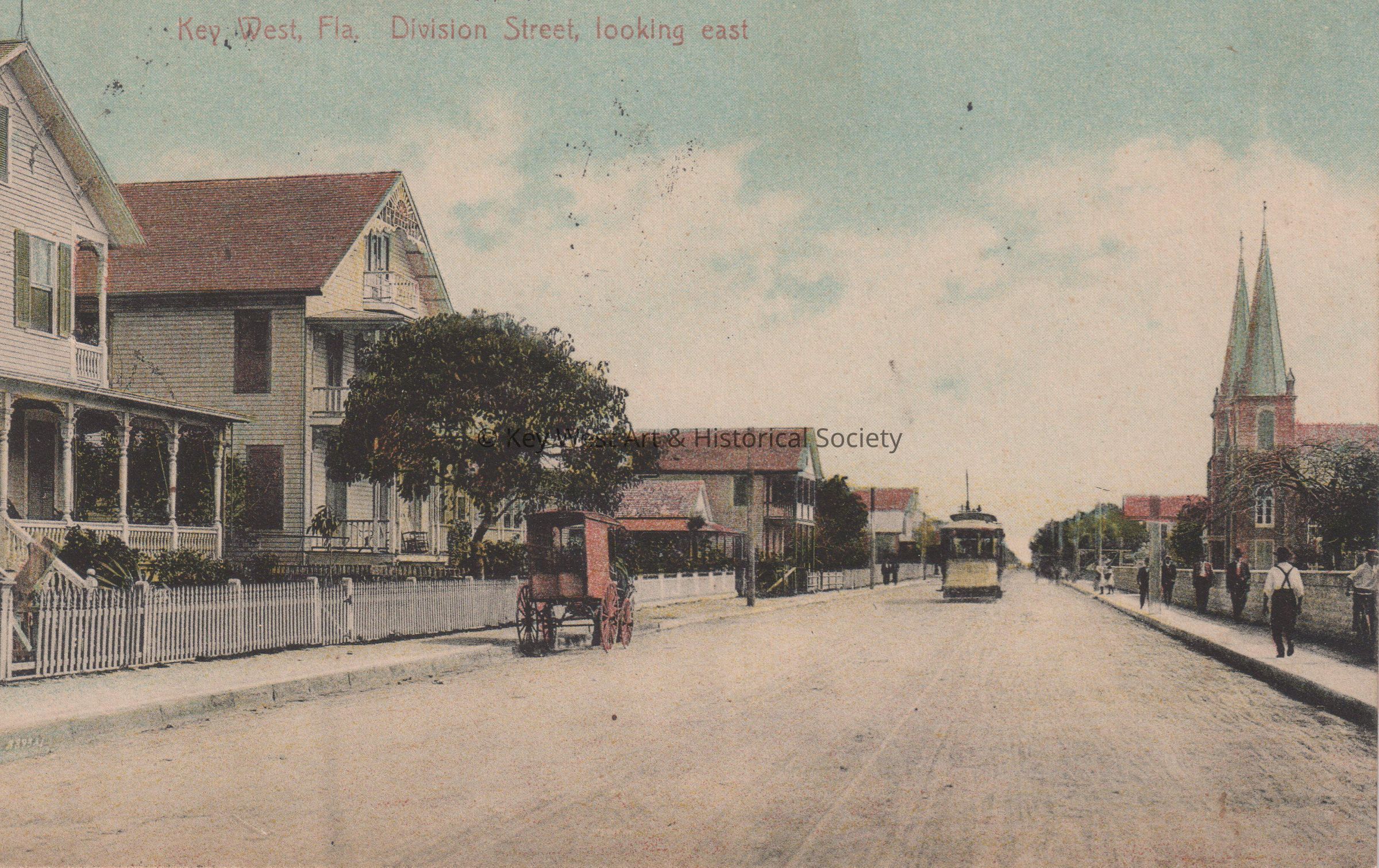 Postcard depicting a streetcar, carriage, and people on Division Street (now Truman Avenue) in Key West, Florida. The caption reads, ‘Key West Florida, Division Street Looking east’. The message on the verso reads, ‘What a fine Street. Ha ha. Hope you are well. Morgan.’ The postcard is addressed to Sister Louis Gabriel, Convent, City, and is postmarked Key West, February 21, 1910.Subject Place