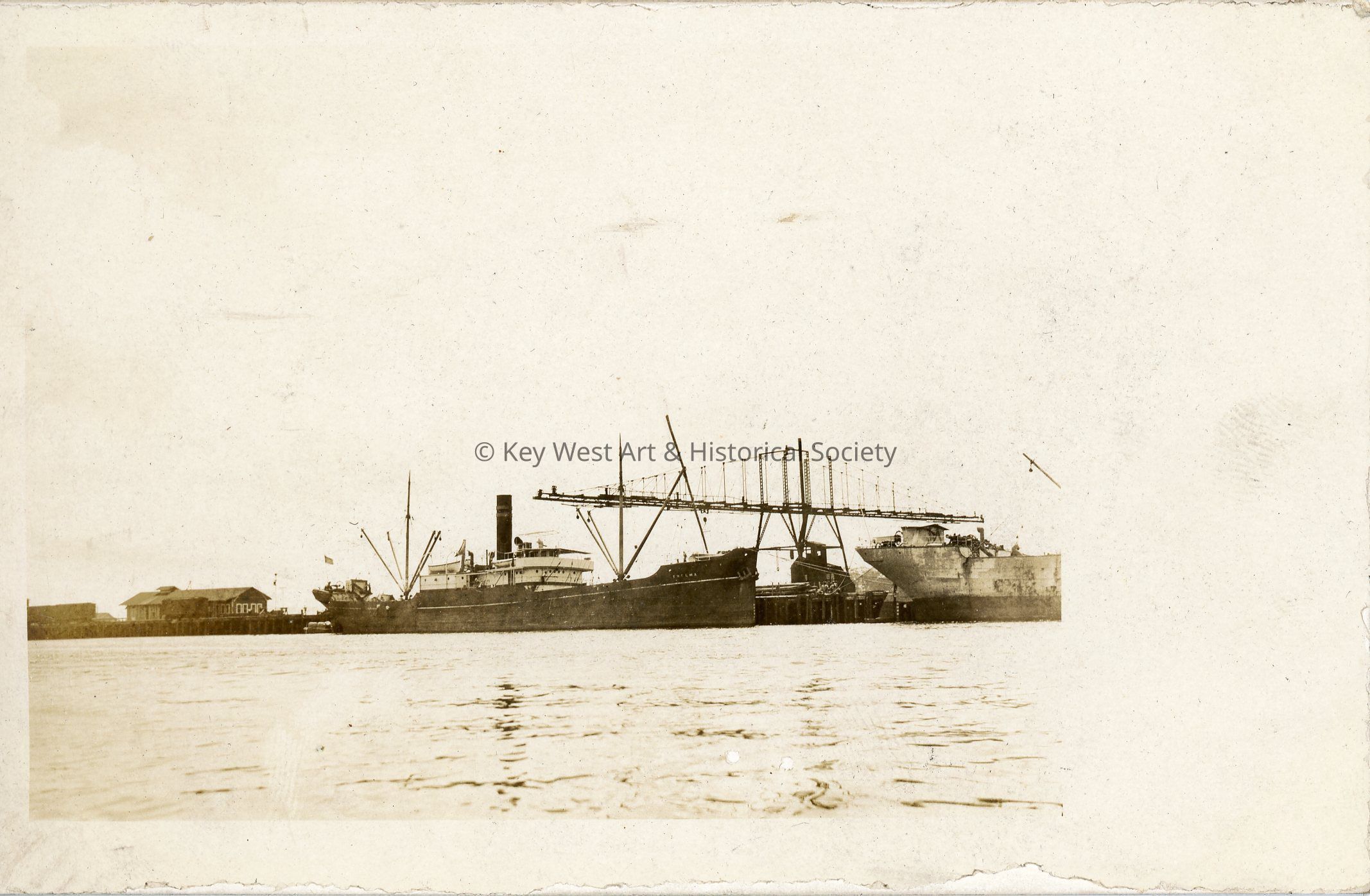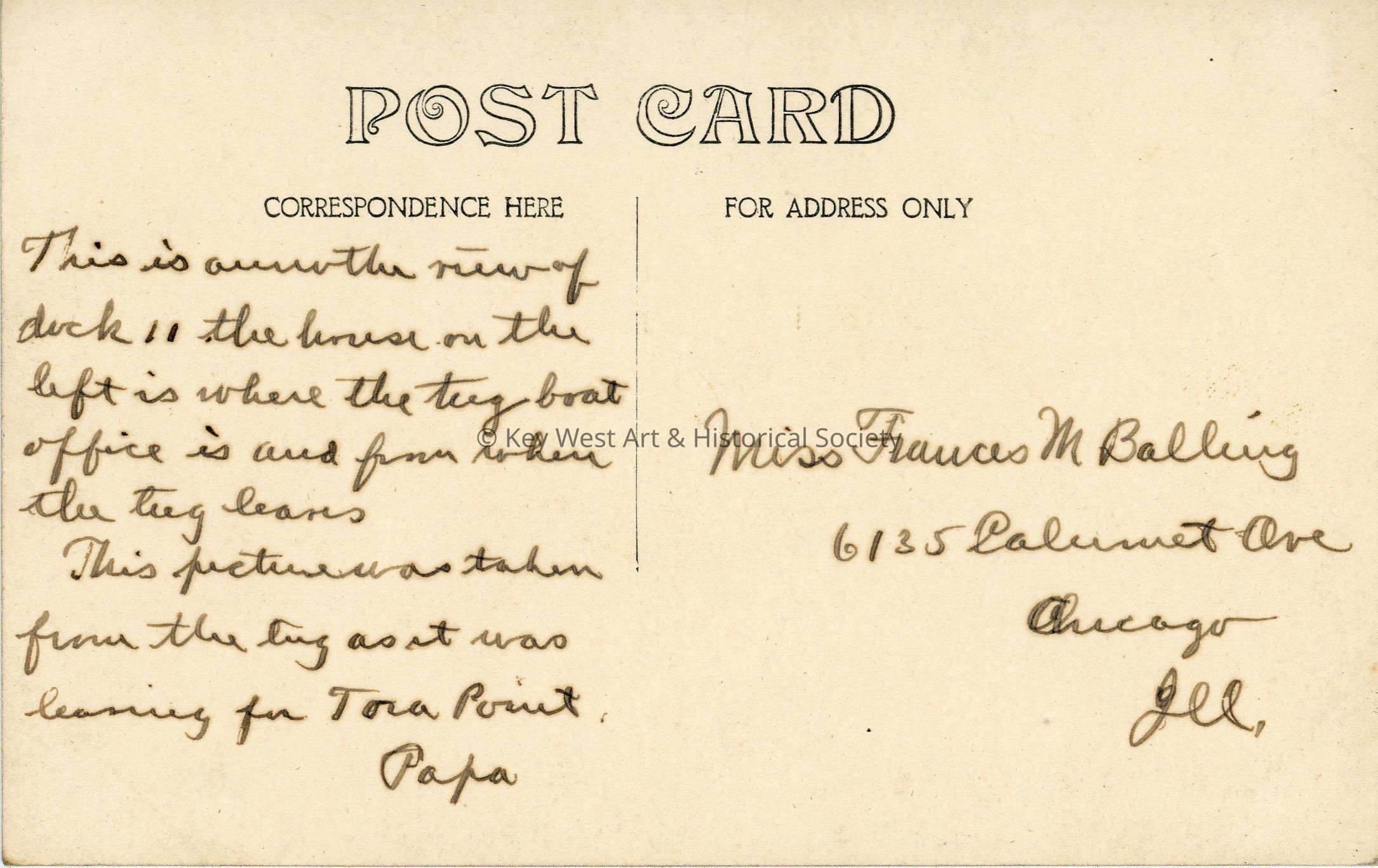 Black and white photograph postcard depicting Dock 11 (eleven) on the Panama Canal near Gatun. The building on the left is the tug boat office. The postcard is addressed to Miss Frances M. Balling. Verso has a handwritten note.Subject