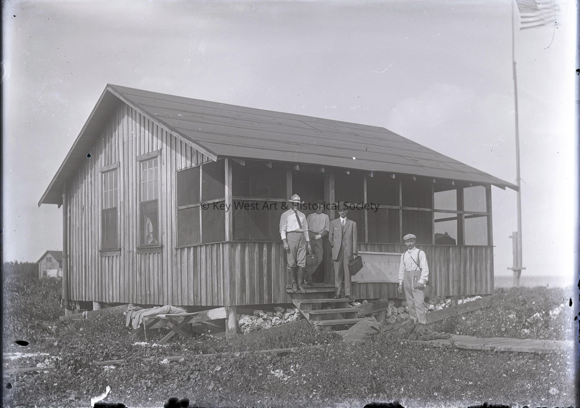 Black and white dry plate glass negative of the unknown men standing in front of a building on Pigeon Key. One of the men is possibly a doctor. The image was taken during the construction of Seven Mile Bridge on the Overseas Railway.